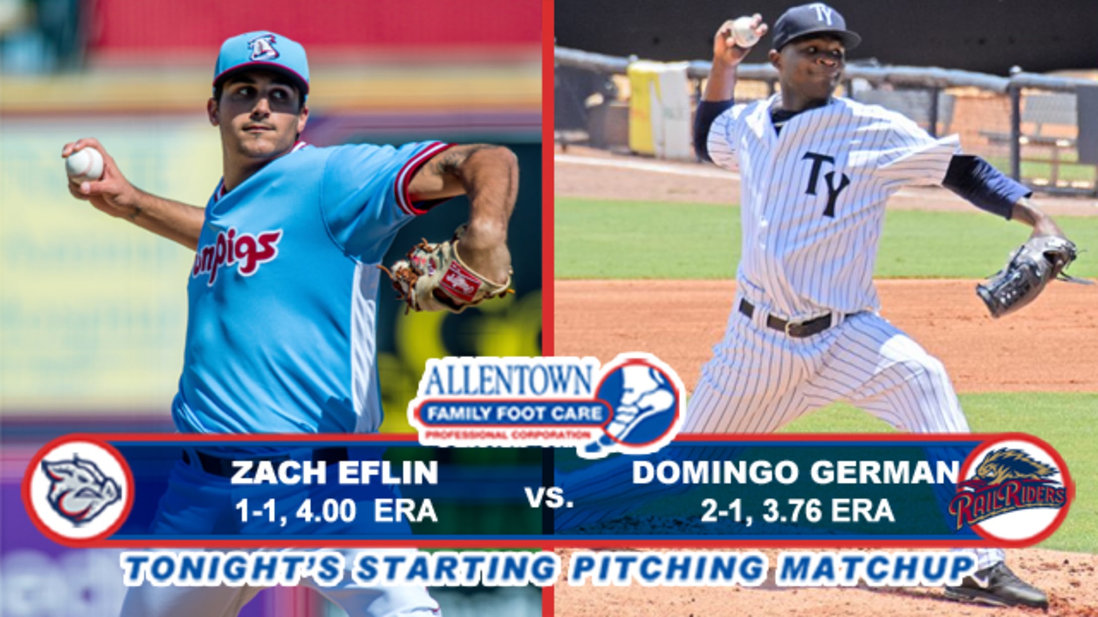 The Pigs will send right-hander Zach Efflin (1-1, 4.80) and the RailRiders will send right-hander