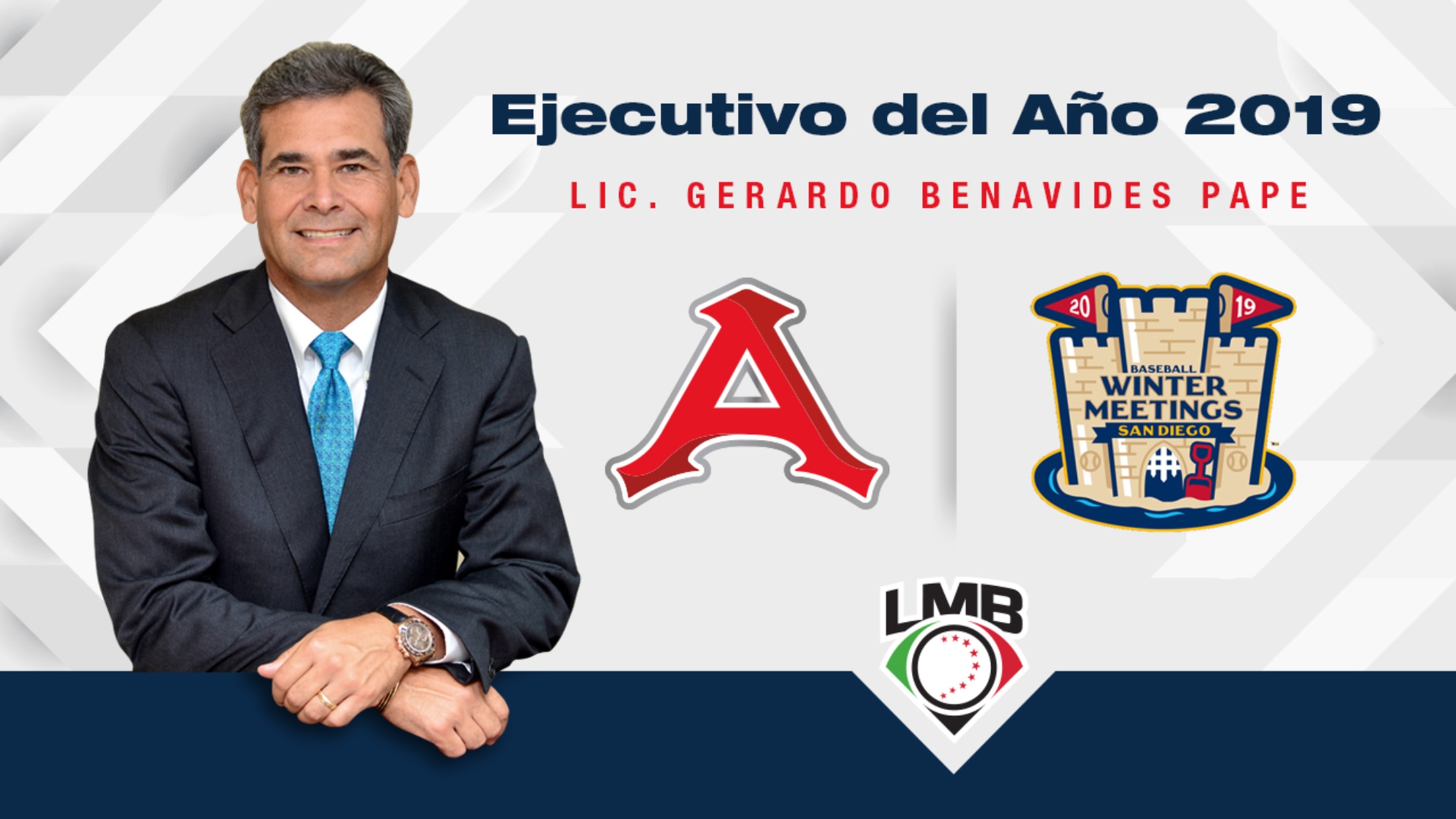 San Diego, California (lmb.com.mx) 9 de diciembre. - La Liga Mexicana de Beisbol felicita al Lic. Gerardo Benavides Pape, Presidente del Consejo de Administración del club Acereros de Monclova, por su designación como Ejecutivo del Año 2019, reconocimiento recibido en el marco de las Reuniones Invernales del beisbol organizado, celebradas