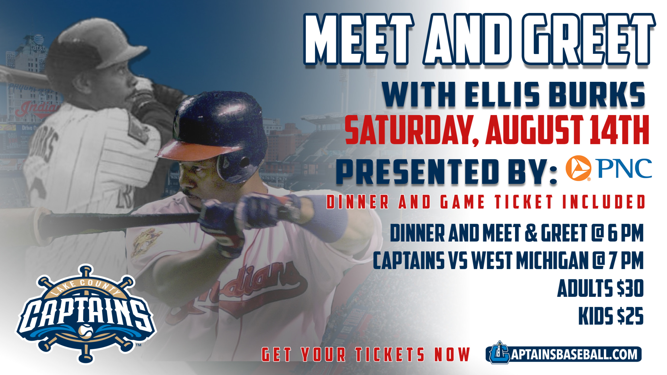 (Eastlake, OH) – The Lake County Captains today announced that former major league outfielder Ellis Burks will make an appearance at Classic Park for a meet-and-greet on August 14. The meet-and-greet is presented by PNC and will take place before the Captains game against the West Michigan Whitecaps. First pitch