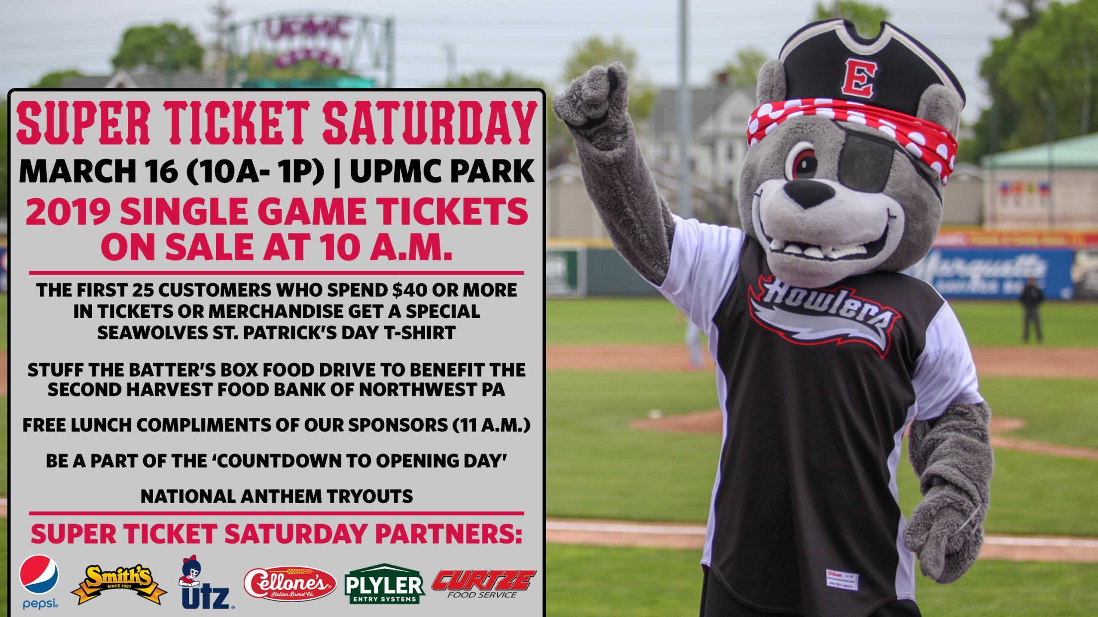 The SeaWolves announced today that the team will host SUPER TICKET SATURDAY on Saturday, March 16 from 10 a.m. until 1 p.m. to mark the start of single-game ticket sales for the 25th Season of SeaWolves Baseball. Starting at 10 a.m., fans can purchase single-game tickets at the UPMC Park ticket office, online at SeaWolves.com or via phone by calling 814.456.1300.