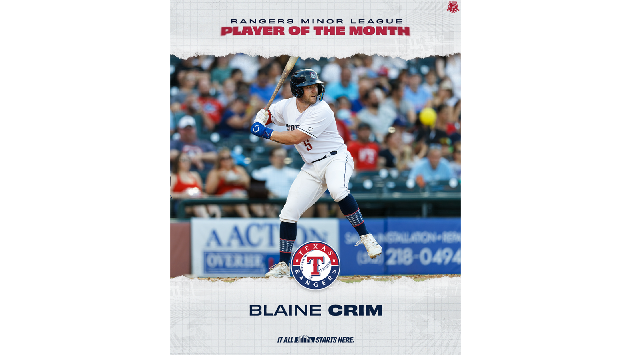 ROUND ROCK, Texas – The Texas Rangers announced their minor league award winners for the month of July on Monday afternoon. Round Rock Express 1B Blaine Crim was named the organization’s Player of the Month while RHP Grant Anderson was listed as the Reliever of the Month.