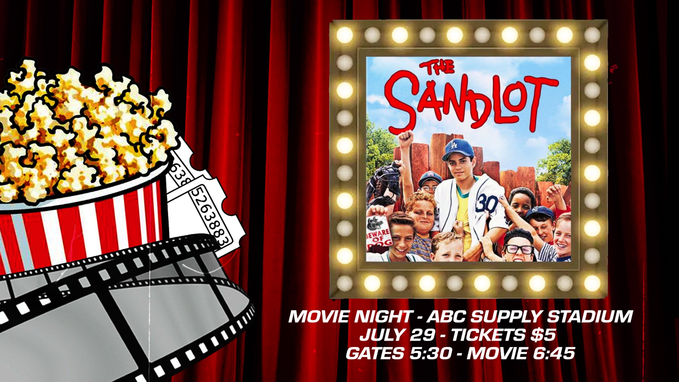Gates to ABC Supply Stadium will officially open for the first time to fans at 5:30 p.m. on Thursday, July 29 and guests will have the opportunity to sit on the field to watch the beloved classic baseball film on the stadium’s 40x40 foot video board, beginning at 7 p.m. Before the movie, kids can run the bases at 5:45 p.m. Fireworks will be launched following the conclusion of the movie.