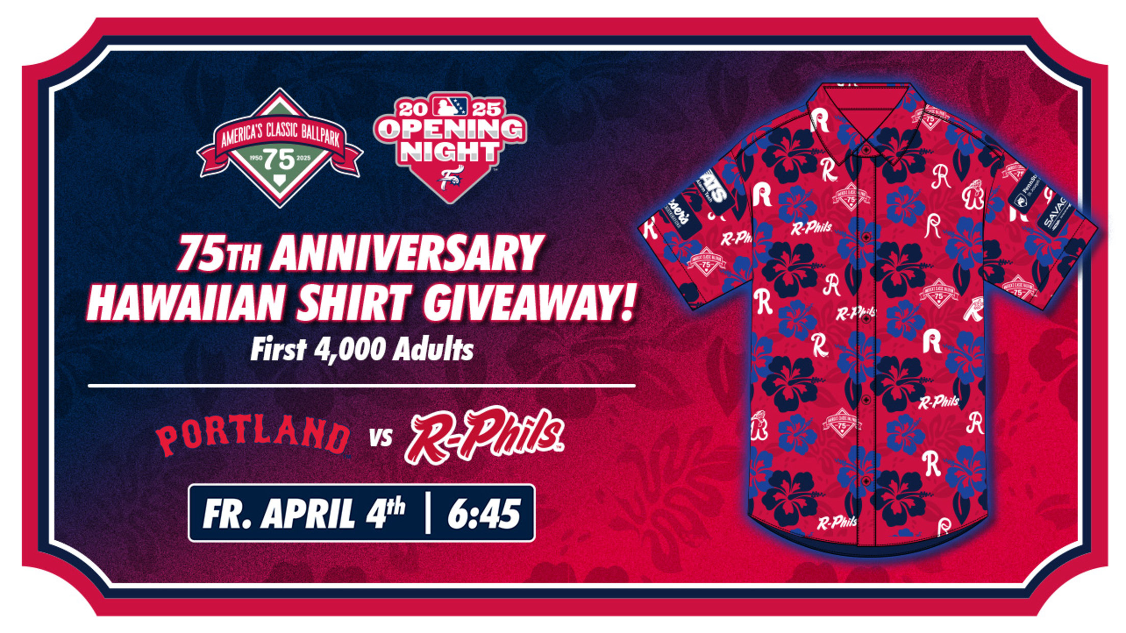 In celebration of the stadium's Diamond Anniversary, the first 4,000 adults at the R-Phils April 4 game against the Portland Sea Dogs (Red Sox) will receive an R-Phils Hawaiian Shirt commemorating the 75th Anniversary of FirstEnergy Stadium. It will be sponsored by Savage Auto Group, Penn State Health St. Joseph, Feesers and Alarm Tech.