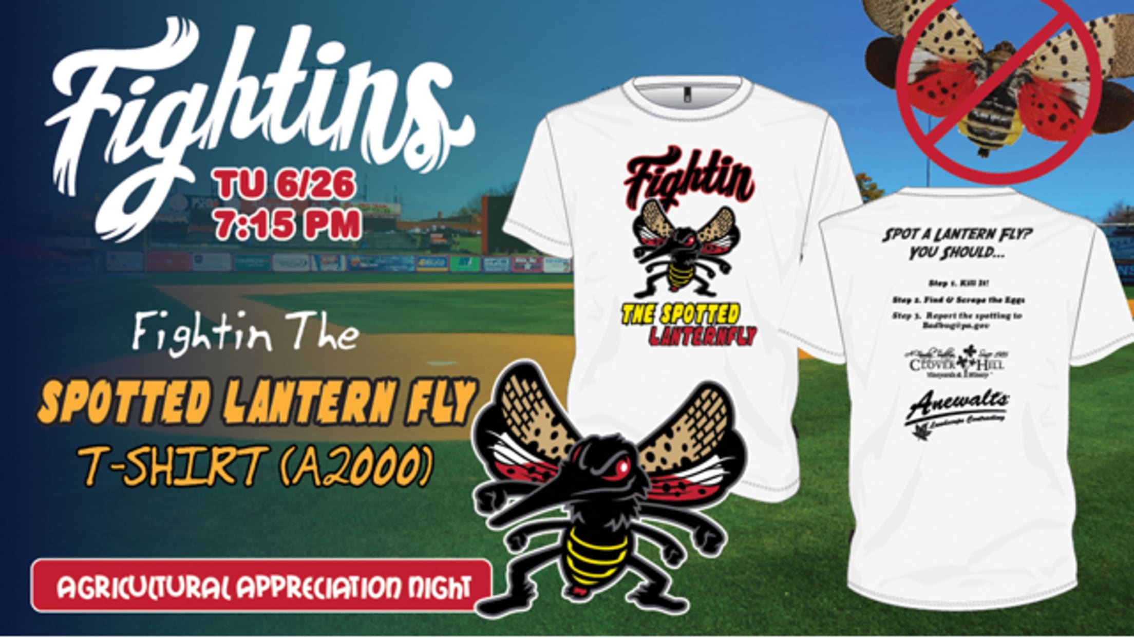 (Reading, PA) - The Reading Fightin Phils, proud double-A affiliate of the Philadelphia Phillies, have announced they will be hosting Agricultural Appreciation Night to stop the Spotted Lanternfly on Tuesday, June 26th at 7:15 p.m. at FirstEnergy Stadium. The first 2,000 adults will receive a Fightin the Spotted Lanterfly T-Shirt courtesy of Anewalts Landscape Contracting and Clover Hill Vineyards and Winery.