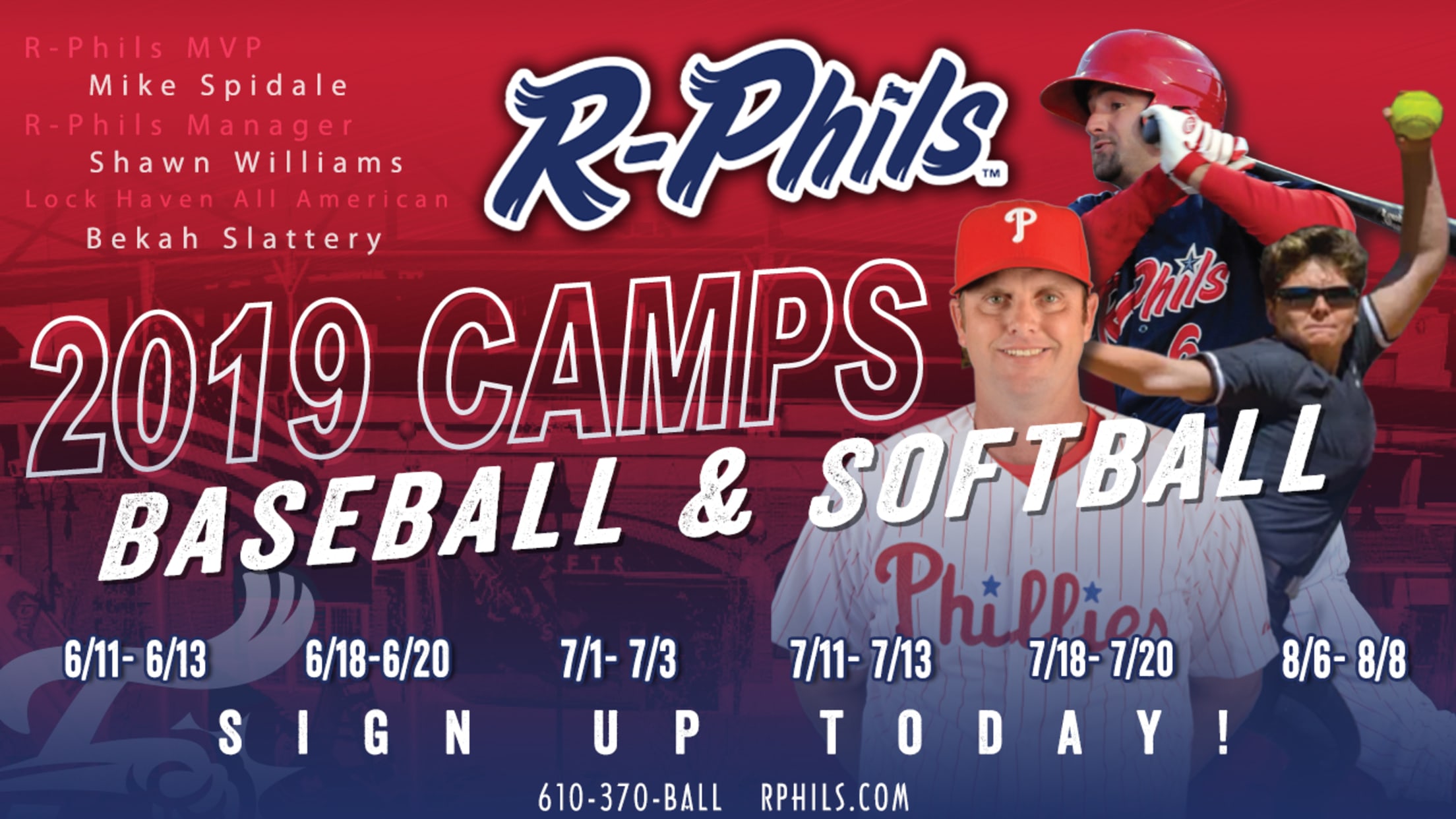 (Reading, PA) - The Reading Fightin Phils will play host to a series of baseball and softball camps this summer, led by Baseballtown Hall of Famer Mike Spidale, Fightins manager Shawn Williams, and Lock Haven softball Preseason All-American Bekah Slattery.Fightin Phils Baseball Camps are for children ages 7-14. The camps