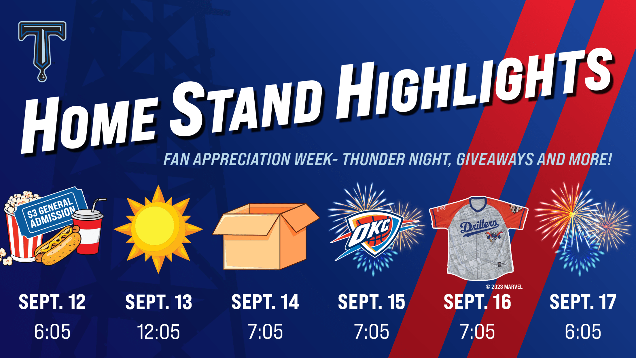 The Tulsa Drillers will open their final home stand of the 2023 season on Tuesday, September 12 at ONEOK Field. It will be the opening game of a six-game series with the Corpus Christi Hooks (Houston Astros) that will close out the season. The six games will feature several different