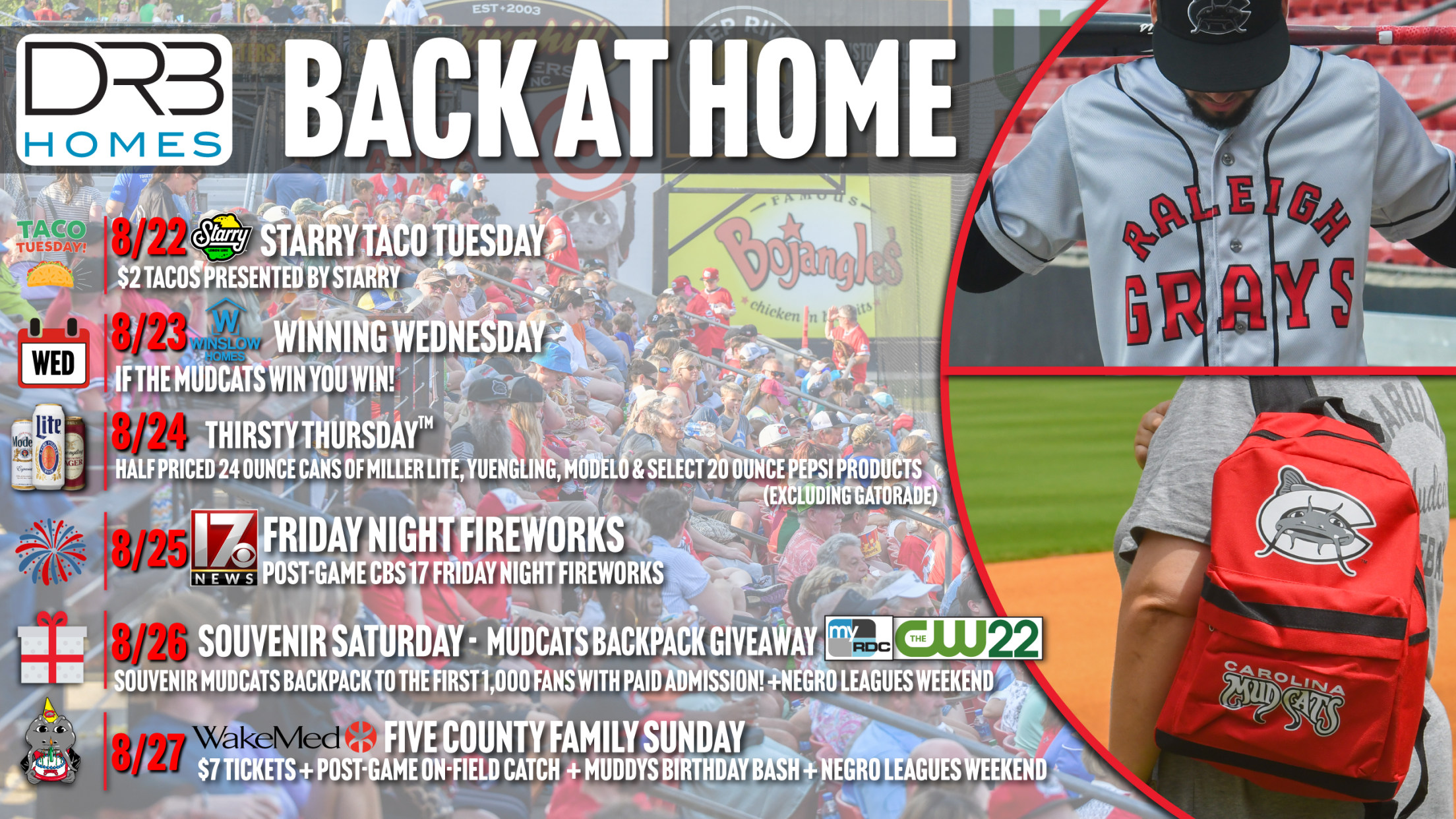 The new homestand includes Starry Taco Tuesday on Tuesday, August 22, Winslow Homes Winning Wednesday on Wednesday, August 23 and Thirsty Thursday™ on Thursday, August 24. The weekend schedule is jam-packed with Friday Night Fireworks presented by CBS 17 News on Friday, August 25, Souvenir Saturday featuring a souvenir backpack giveaway presented by The CW 22 and MyRDC on Saturday, August 26 as well as Muddy's Birthday and WakeMed Five County Family Sunday featuring $7.00 box seat tickets and post-game catch on Sunday, August 27.