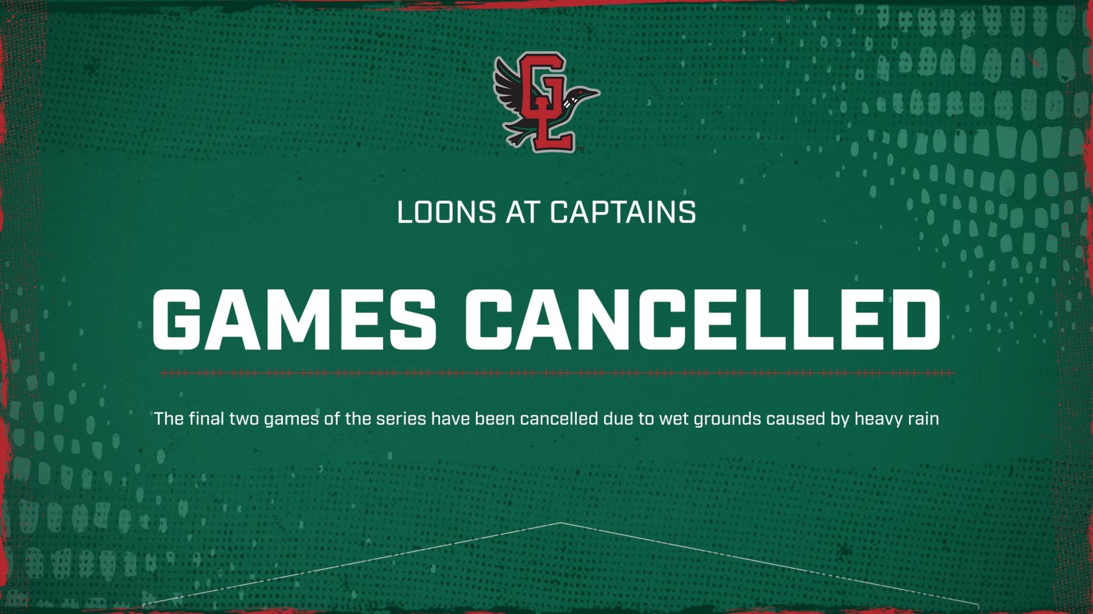 EASTLAKE, Ohio. – The Great Lakes Loons (59-53) (25-21) and Lake County Captains (65-47) (24-22) Saturday night game that was suspended due to heavy rain and Sunday’s scheduled series finale have been canceled due to wet grounds. At the time of the suspension on Saturday, Great Lakes was up 3-0