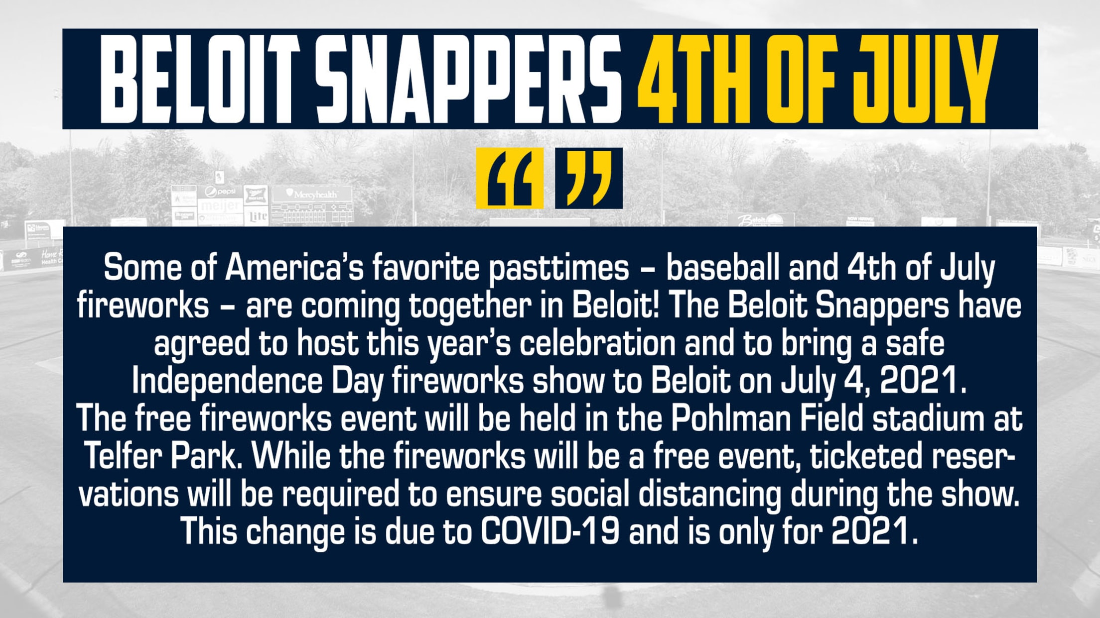 “The Beloit Snappers are proud to step up to the plate and bring our community together to celebrate our nation,” said Snappers President Jeff Jurgella. “As we are spending our last few months at Pohlman Field, this is an excellent opportunity to show our ongoing commitment to Beloit. The past year has been difficult for Beloit, and we’re thrilled to support this event.”