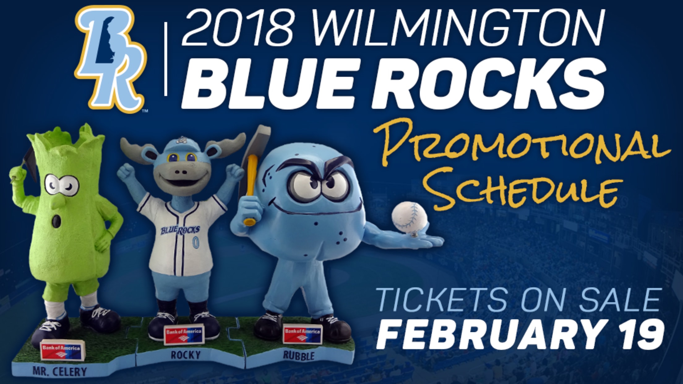 The Blue Rocks' second annual Bank of America Bobblehead Series, will celebrate the team's cherished mascots. The first 1,000 fans will receive a Rubble bobblehead on Saturday, May 26, a Mr. Celery bobblehead on Saturday, July 14 and a Rocky Bluewinkle bobblehead on Saturday, August 4. For fans that collect all three, the figurines will connect into the shape of the state of Delaware at the base. July 14 will be a day focused on Mr. C, as the Rocks throw their second annual "Celery-bration." On top of the bobblehead giveaway, all fans will receive a stalk of celery and the team will don special Mr. Celery themed uniforms.