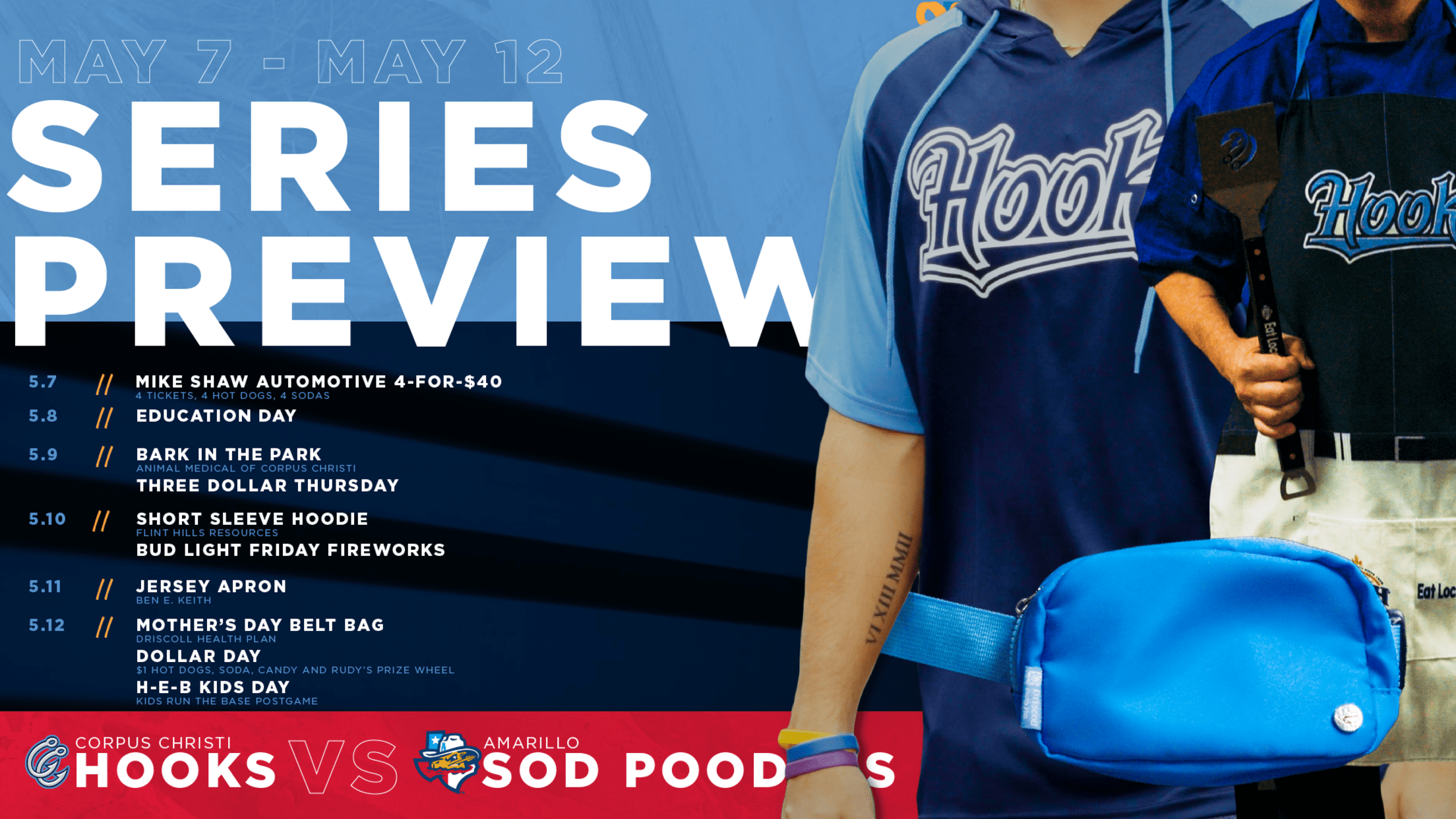 CORPUS CHRISTI – Your Corpus Christi Hooks resume their two-week homestand as they welcome the Amarillo Sod Poodles, Double-A affiliate of the Arizona Diamondbacks, to town for a six-game series Tuesday, May 7 through Sunday, May 12 at Whataburger Field.