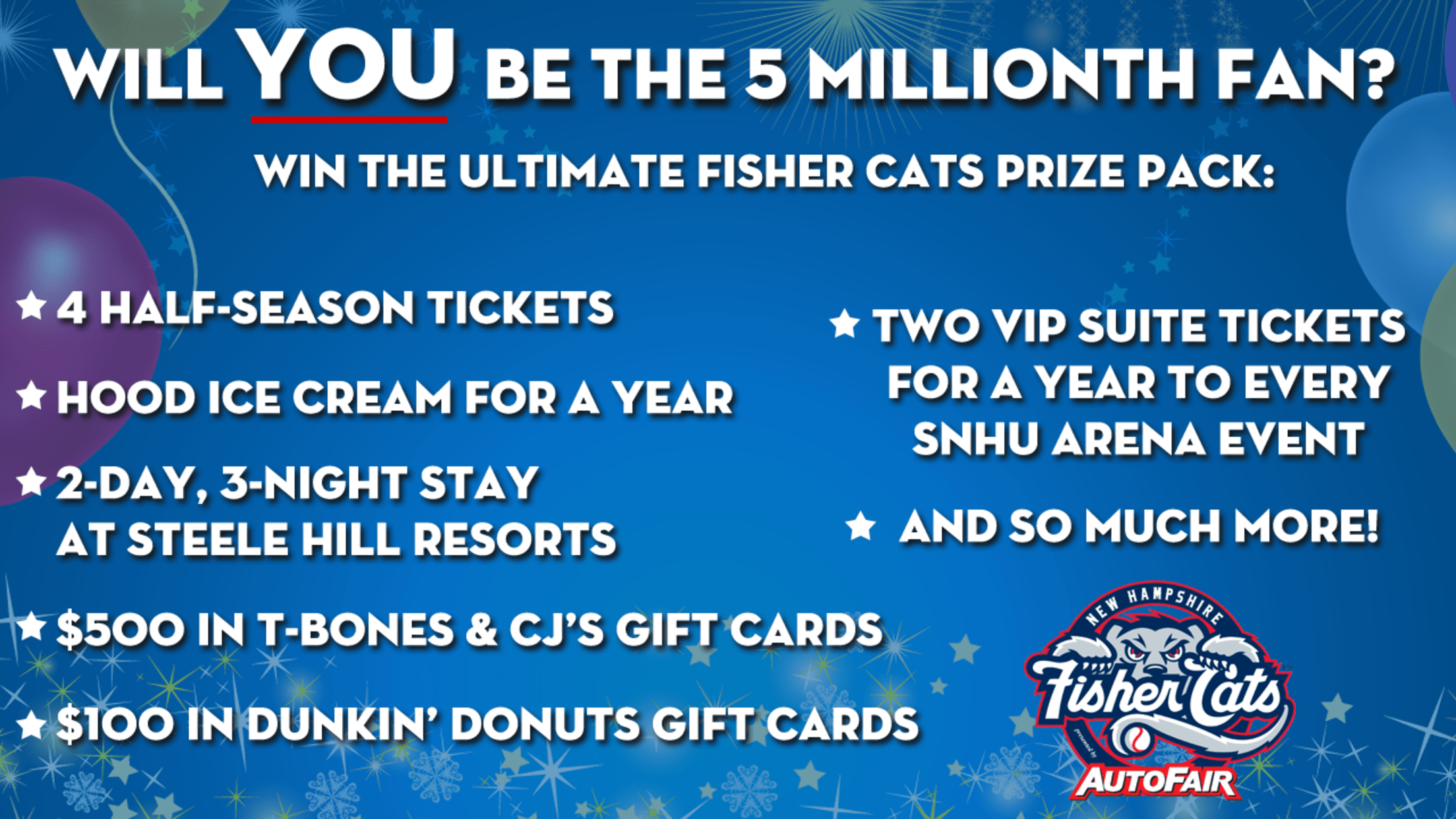 "To be able to welcome our 5 millionth fan is a testament to this community and our passionate fanbase, and we can't thank our corporate partners enough for helping us put together an unbelievable prize pack," said Fisher Cats President Mike Ramshaw, who has been with the team since 2006. "For all the highlights we've had during our 15th season, celebrating this milestone with that lucky fan is going to be one of the best moments of the year."