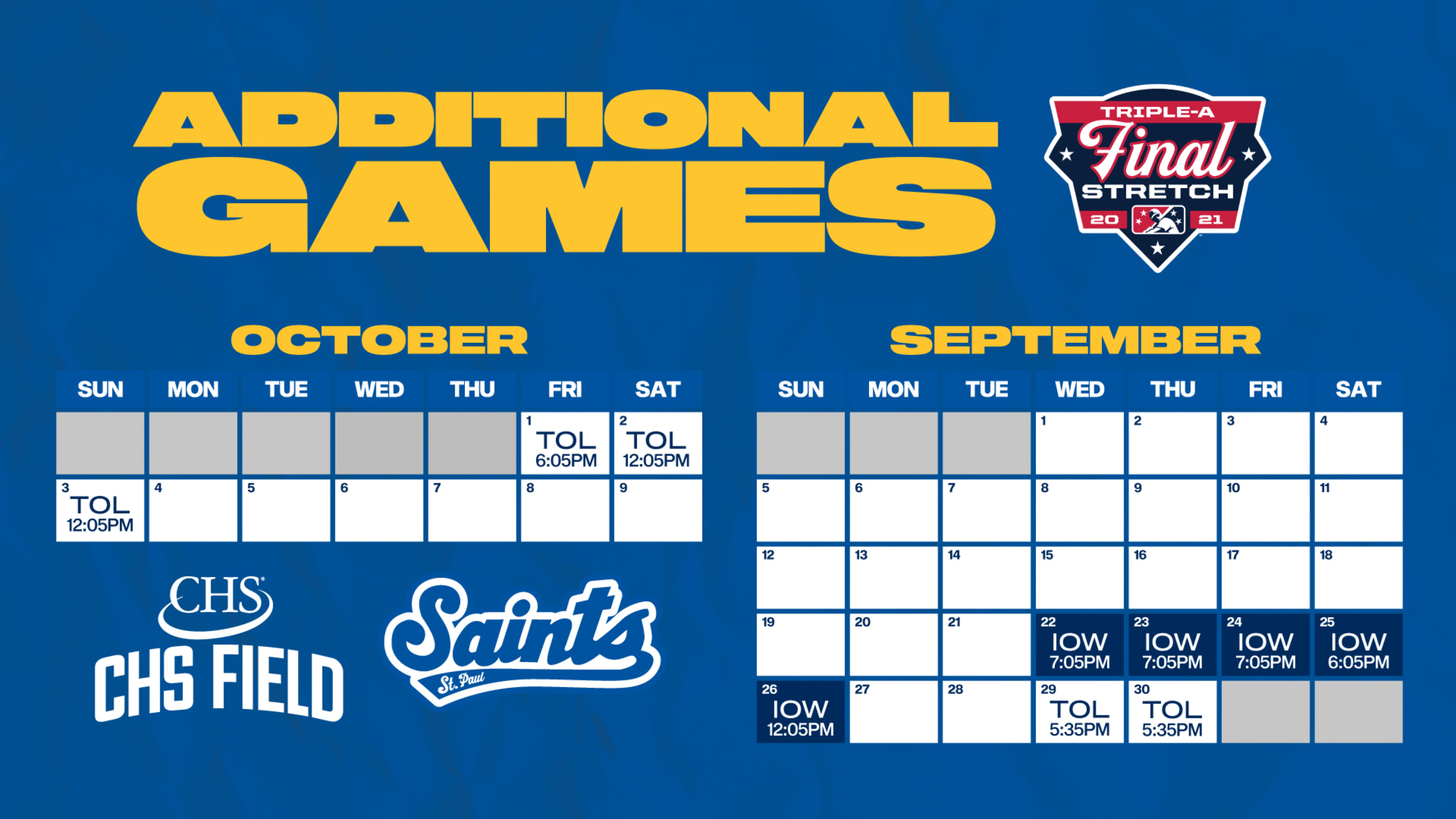 Minor League Baseball and Major League Baseball announced that all Triple-A teams will add 10 games, known as the “Triple-A Final Stretch” which consists of two, five-game series, to the end of the schedule. The Saints will take on the Iowa Cubs (Chicago Cubs) from September 22-26 at CHS Field and will travel to the Toledo Mud Hens (Detroit Tigers) from September 29-October 3.