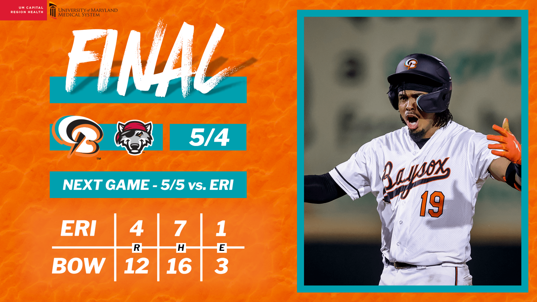 The offensive output for Bowie sees a season high with 12 runs on 16 hits, while matching the largest margin of victory (eight runs) from Opening Day in Hartford. The Baysox, now 7-15 on the season, look to even the six-game set with Erie on Friday night at Prince George’s Stadium. First pitch is set for 7:05 p.m. ET.