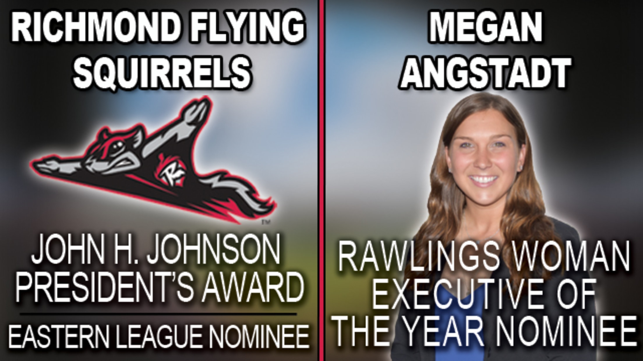 RVA - The Richmond Flying Squirrels, Double-A affiliate of the San Francisco Giants, are honored to be the Eastern League's nominee for two prestigious postseason awards. The Flying Squirrels organization has been nominated for the John H. Johnson President's Award, presented annually by Minor League Baseball to recognize the "complete" baseball franchise that has demonstrated franchise stability while making significant contributions to its community, its league and to the baseball industry. Additionally, Flying Squirrels Director of Community Relations and Flying Squirrels Charities, Megan Angstadt, is the Eastern League's nominee for the Rawlings Woman Executive of the Year. The award is given annually to one woman who has made an outstanding contribution to her club, league or to baseball.u5:p