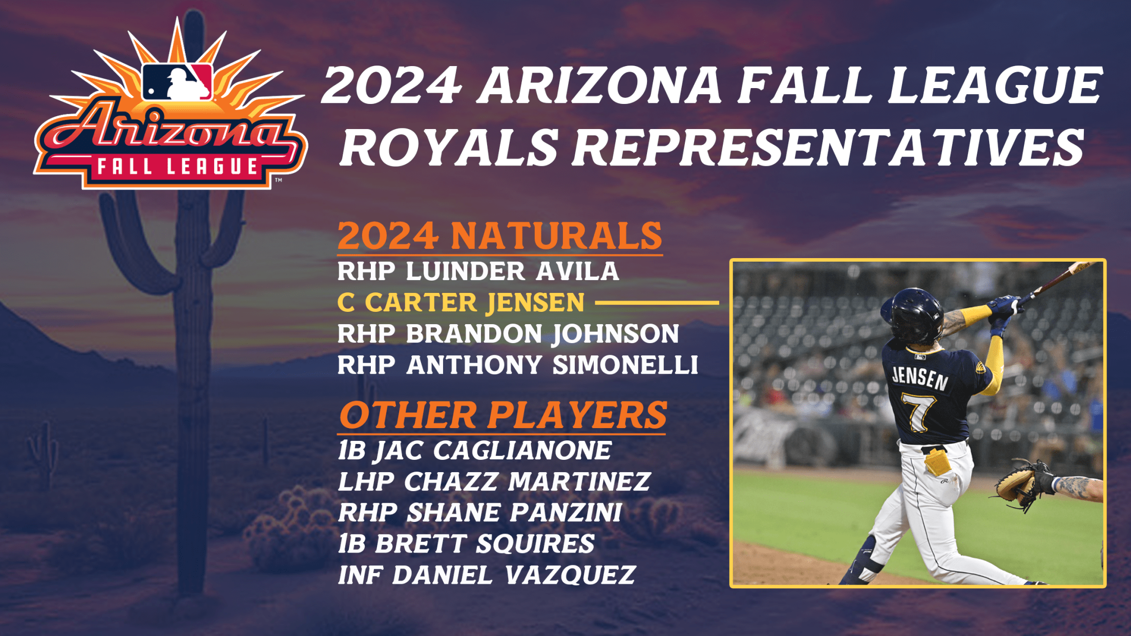 SPRINGDALE, Ark. – Every fall Minor League Baseball’s top prospects converge on Arizona to take part in the Arizona Fall League (AFL). The 2024 Northwest Arkansas Naturals are well represented in this year’s AFL with four of the Royals’ nine participants having donned a Northwest Arkansas uniform this season. Catcher and Royals fifth-ranked prospect, Carter Jensen, is joined by Kansas City’s #26 prospect and right-handed pitcher Luinder Avila. Right-handed pitchers Brandon Johnson and Anthony Simonelli are also set to take the field for the Surprise Saguaros.