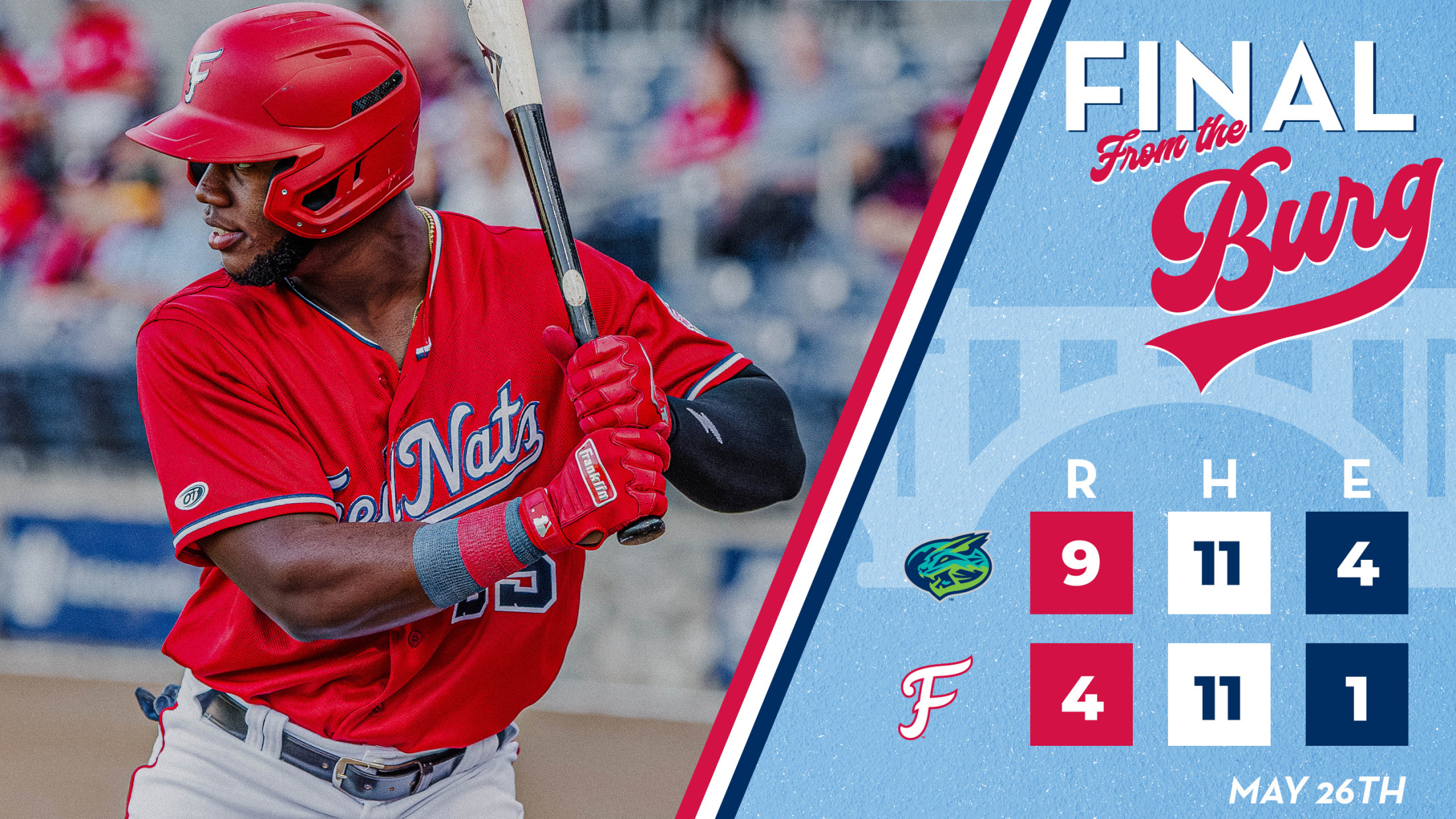 FREDERICKSBURG, VA - The FredNats battled all day, but could not find the timely hit in a 9-4 loss against the Lynchburg Hillcats. With the loss, Fredericksburg is now 27-18 and Lynchburg is 24-21.
