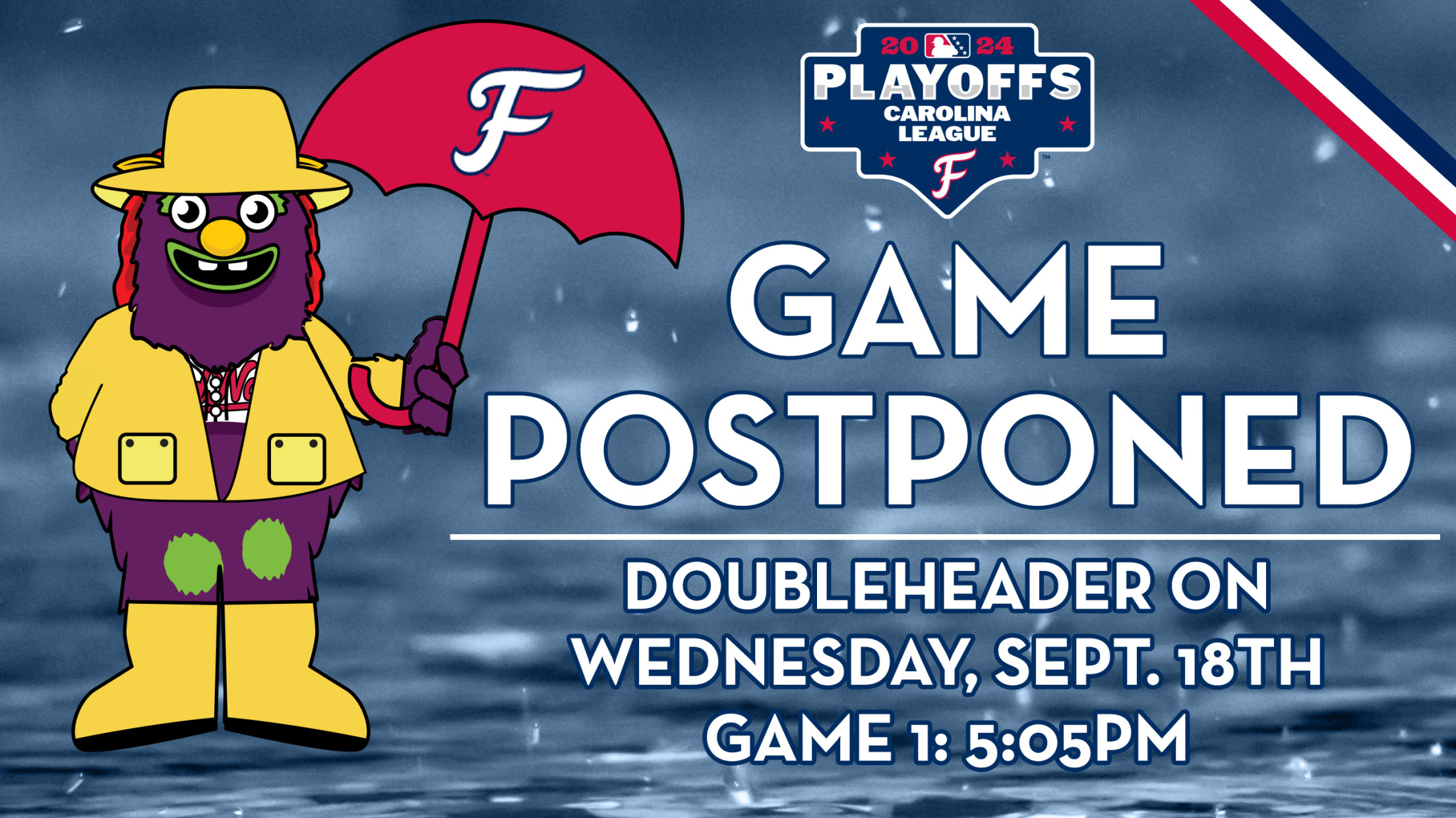FREDERICKSBURG, VA - Game two of tonight's Carolina League Championship Series between Fredericksburg and Kannapolis has been postponed due to weather. The two teams will play a potential doubleheader tomorrow with game one beginning at 5:05 p.m. Both games will be seven innings. If Fredericksburg wins the first game, they