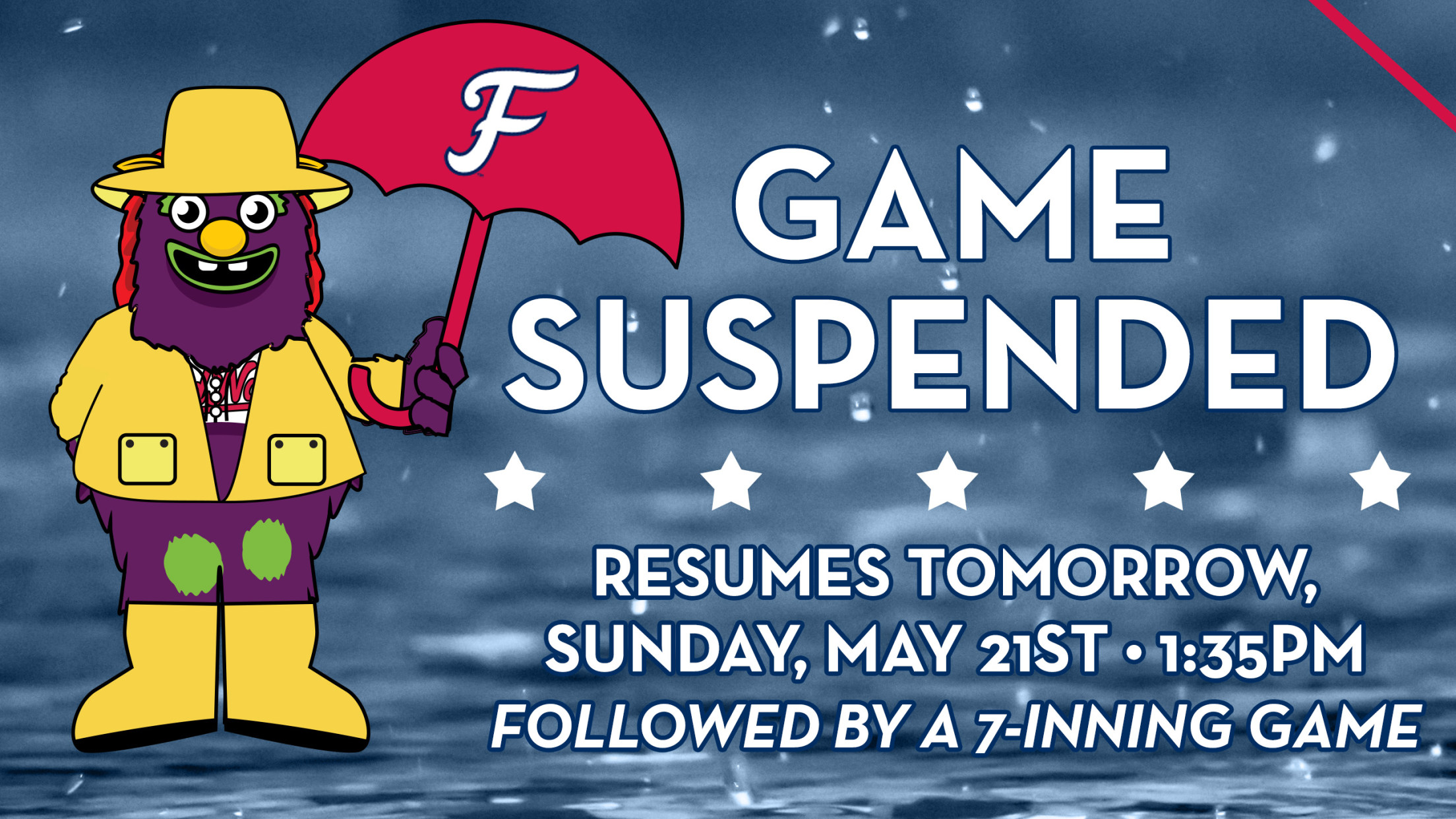 FREDERICKSBURG, VA – Tonight's game between the FredNats and Columbia Fireflies has been suspended due to weather. The two teams will finish the game tomorrow starting at 1:35 p.m. They will then play another 7-inning game following the completion of tonight's game. Fans who had tickets to tonight's game can