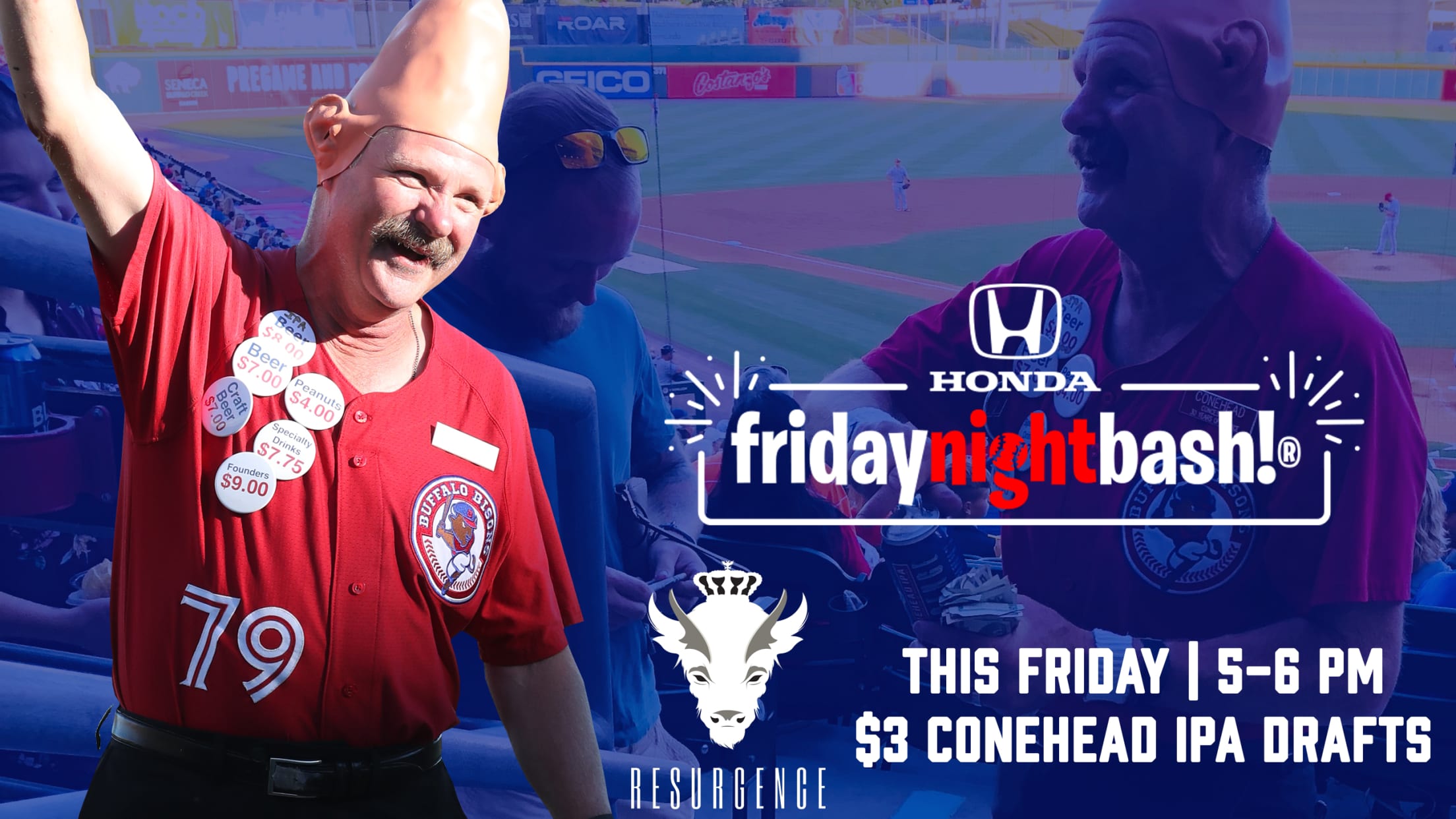 The Resurgence Brewing Happy Hour will also include $3 food specials as fans get ready for the Bisons game at 7:05 p.m. This is also the second to last Honda fridaynightbash! of the season.