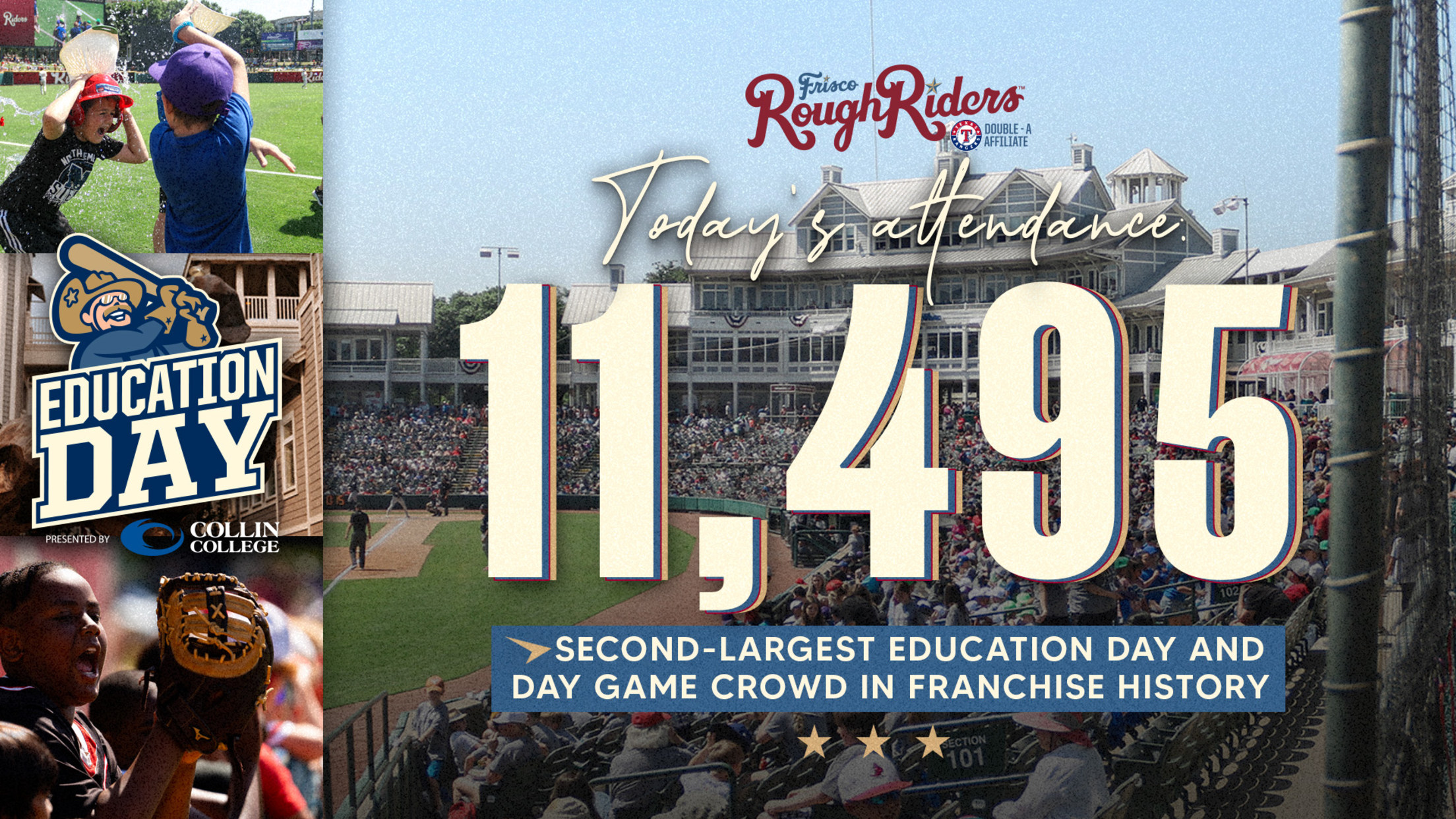 FRISCO, Texas (March 7, 2024) – The Frisco RoughRiders, the Double-A affiliate of the World Series champion Texas Rangers, welcomed the second-largest day game crowd in franchise history on Tuesday with 11,495 fans packing Riders Field for Education Day sponsored by Collin College.