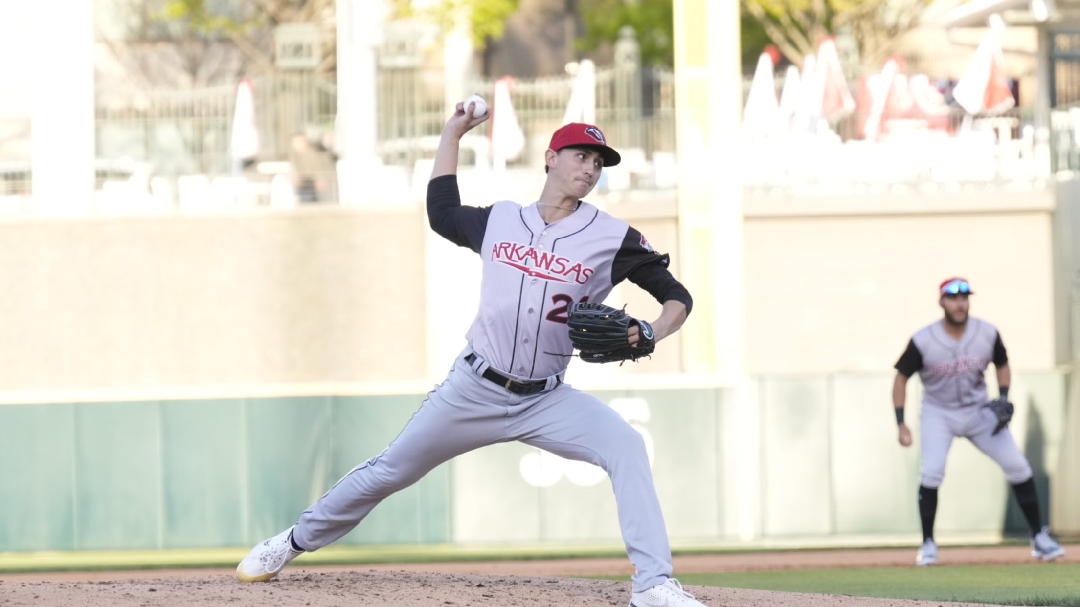 * Arkansas took the lead in the sixth inning. Trailing by a run, Joe Rizzo won a left on left matchup and roped a double into the left field corner scoring Jake Anchia to tie the game. Two batters later, Frisco failed to turn a potential double play and an errant throw to first allowed Rizzo to come home and score.