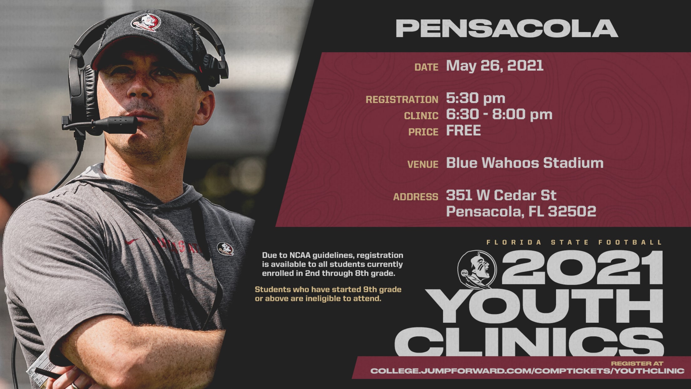 Florida State clinics are open to all youth currently in 8th grade and younger. They will feature fun, age-appropriate instruction from the Florida State football coaching staff, as well as special appearances by FSU football alumni. All clinics will have COVID protocols in place as established by the CDC, FSU and local regulations.