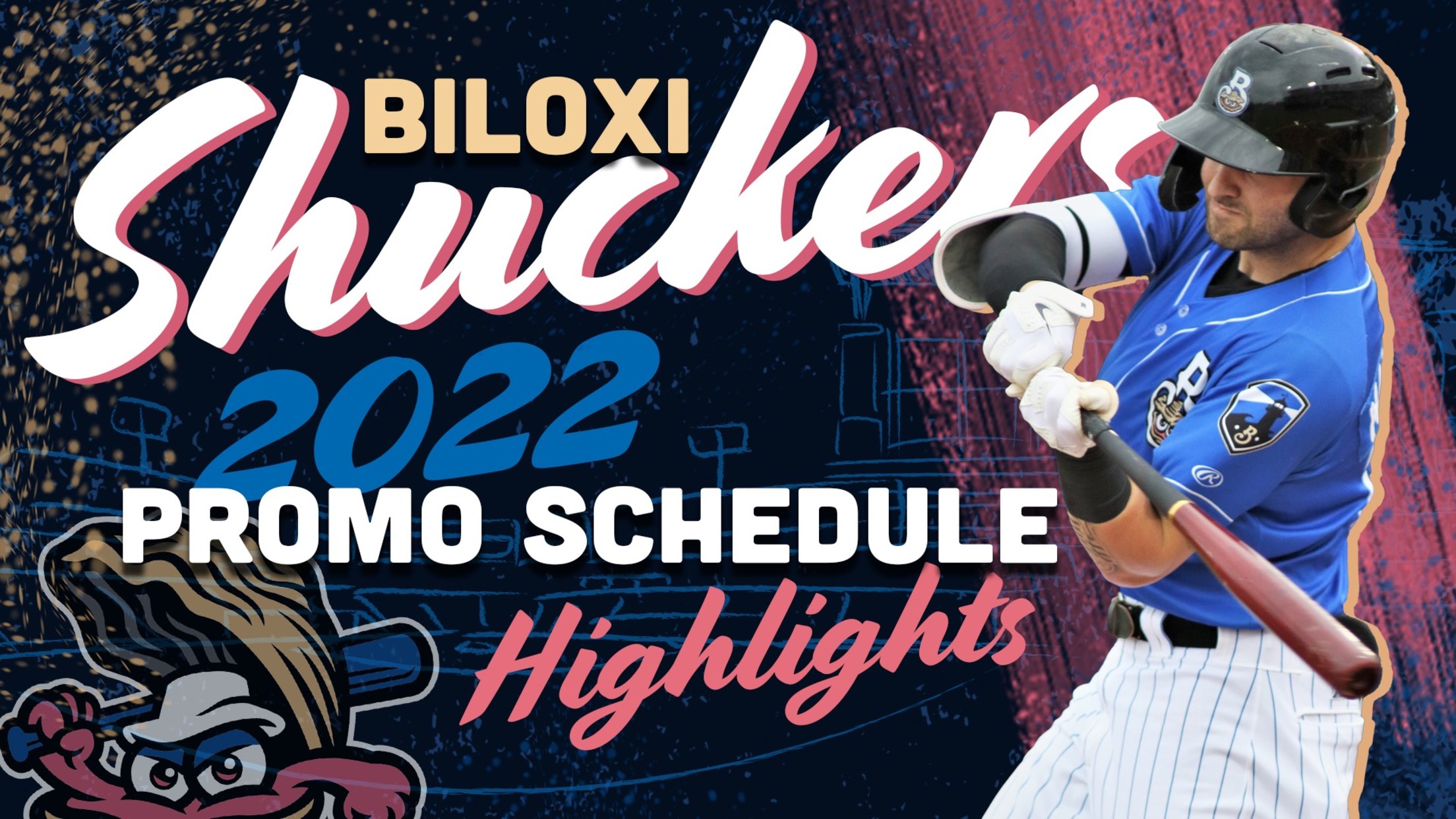 As they kick off their home schedule for their seventh season on the Mississippi Coast, the Biloxi Shuckers have announced their full promotional schedule for the 2022 season. Highlights of the promotional schedule include 13 fireworks shows, 18 giveaways and six specialty jerseys. Some additional promotions are also likely to be added later during the season.