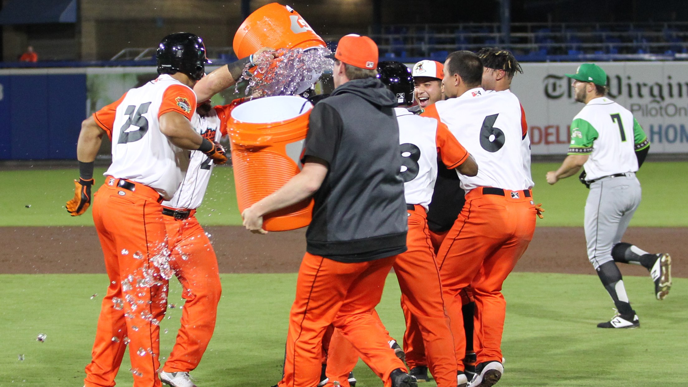 In a wild back-and-forth affair, the Tides entered the ninth inning trailing 13-9 but mounted a furious rally against Knights reliever Ian Hamilton (0-2). Ryan Mountcastle and Jace Peterson opened the inning with back-to-back singles, and Chance Sisco followed by drilling a three-run homer - his second round tripper of the night - to pull the Tides within a run. DJ Stewart singled to continue the rally, then moved to second on a sacrifice bunt by Christopher Bostick. Anderson Feliz lined a single to left to put runners on first and third with one out, and Stewart then raced home to tie the score at 13-13 on a wild pitch from Hamilton. Zach Vincej - the only Tide who had yet to record a hit in the contest - then sliced a check-swing single down the right field line, scoring Feliz and giving the Tides a wild walk-off win.