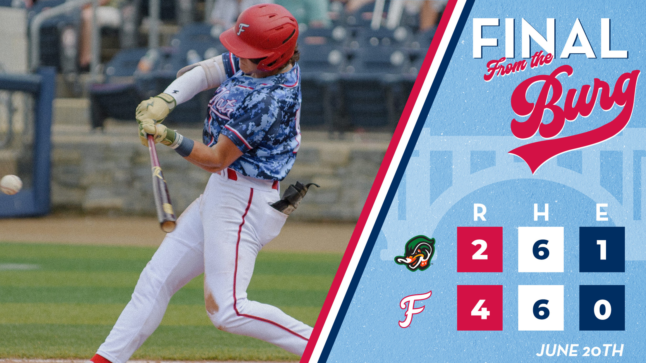 FREDERICKSBURG, VA - Sammy Infante capped off a late FredNat rally as they closed out the first half with a 4-2 win. FXBG closes the half with a 35-31 record, and Down East wraps with a 35-30 mark.