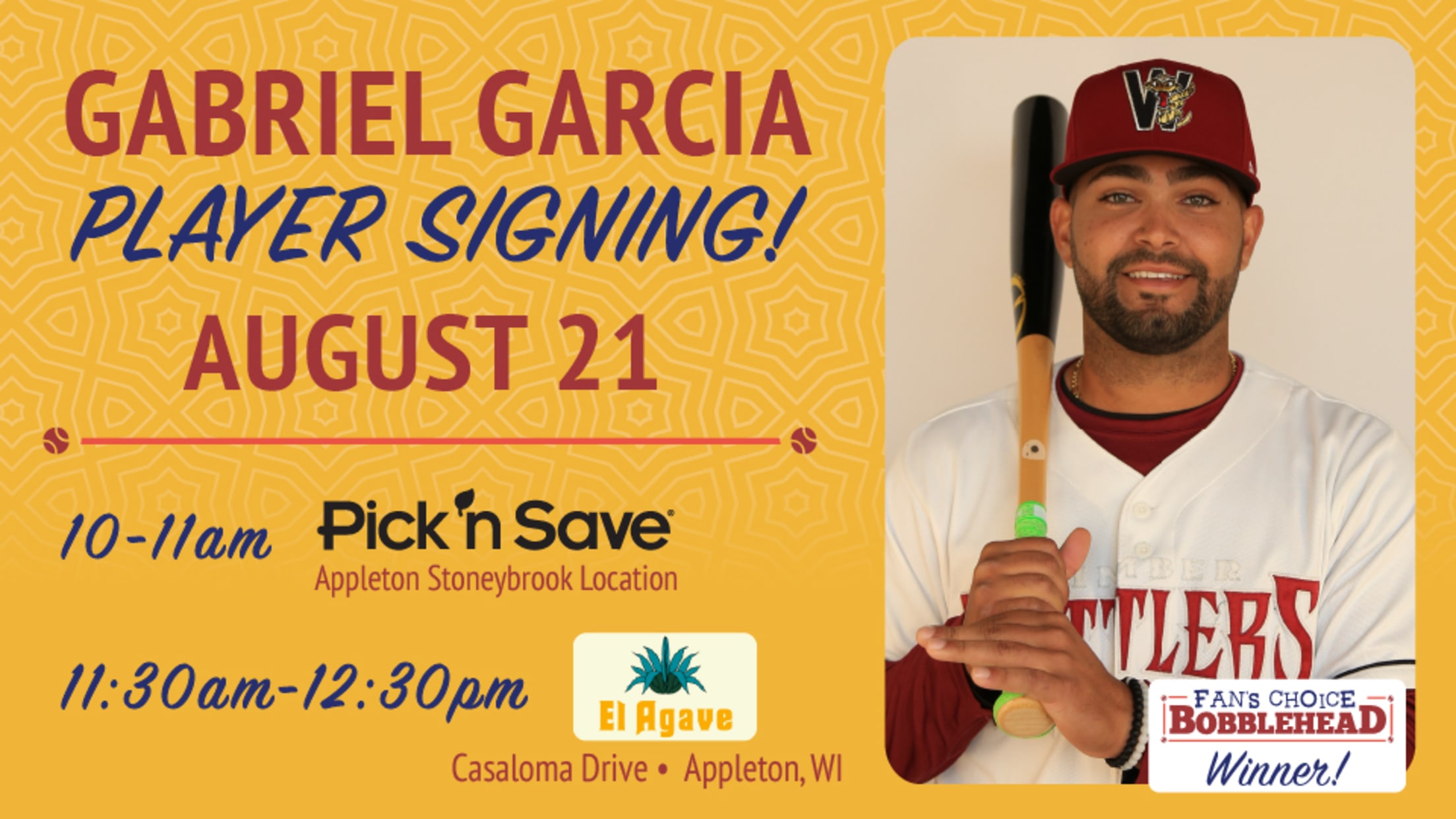 GRAND CHUTE, WI - Wisconsin Timber Rattlers infielder Gabriel García was selected as the Pick 'N Save Fans' Choice bobblehead for the 2018 season and he will be signing autographs at two Fox Cities locations on Tuesday, August 21 in preparation for the bobblehead giveaway on August 30 against the