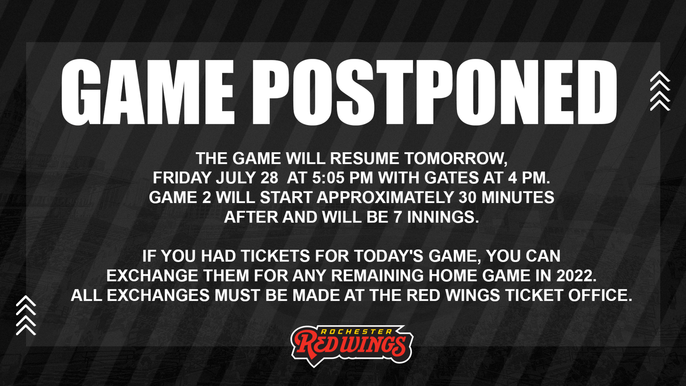 Today’s contest between the Rochester Red Wings and the Scranton-W/B RailRiders at Frontier Field has been suspended in the middle of the third inning due to inclement weather. The Red Wings currently lead the RailRiders, 2-1. The nine-inning contest will resume tomorrow afternoon, Friday, July 29, at 5:05 p.m. and