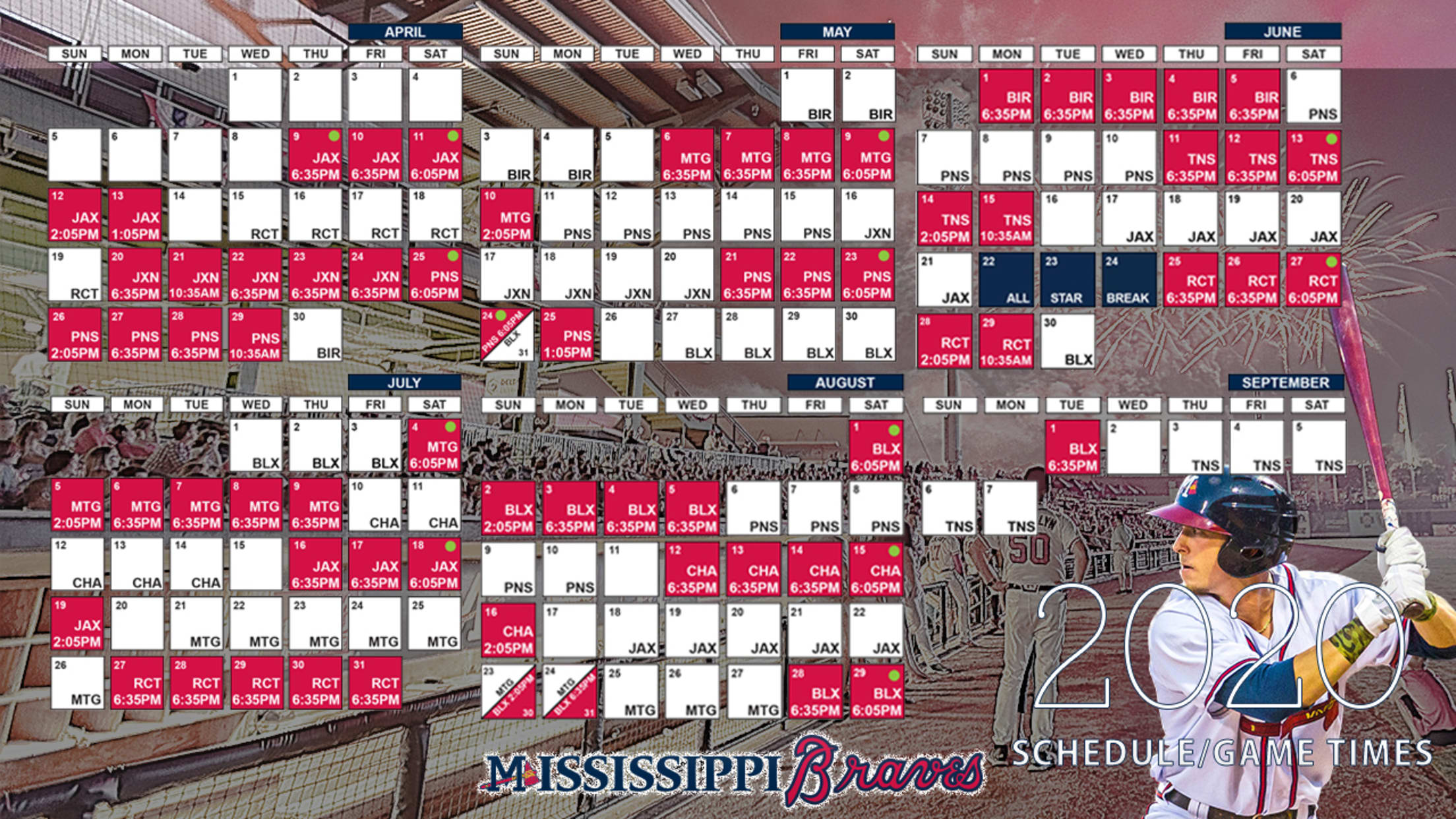 Game times are subject to change. The full 2020 promotional schedule will be announced at a later date. Individual game tickets will go on sale in March. Season Tickets, Mini-Plans, and sponsorship packages for the 2020 season are on sale now. For more information or to pick out your seats today, stop by the Mississippi Braves front office or call 888-BRAVES4.