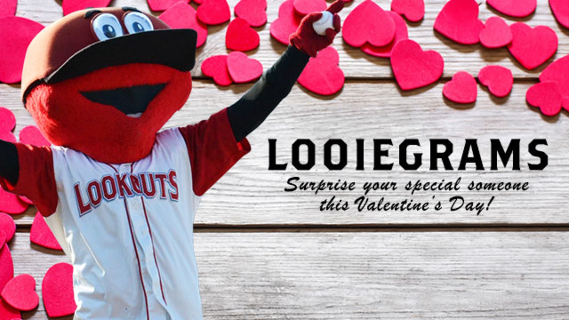 Get your Valentine a Looiegram! Have Looie deliver a rose to your special someone on Feb. 13 or 14. January 18, 2017 Facebook Share X Share Email Copy Link [Empty Body] [Empty Body] Read More: Chattanooga Lookouts
