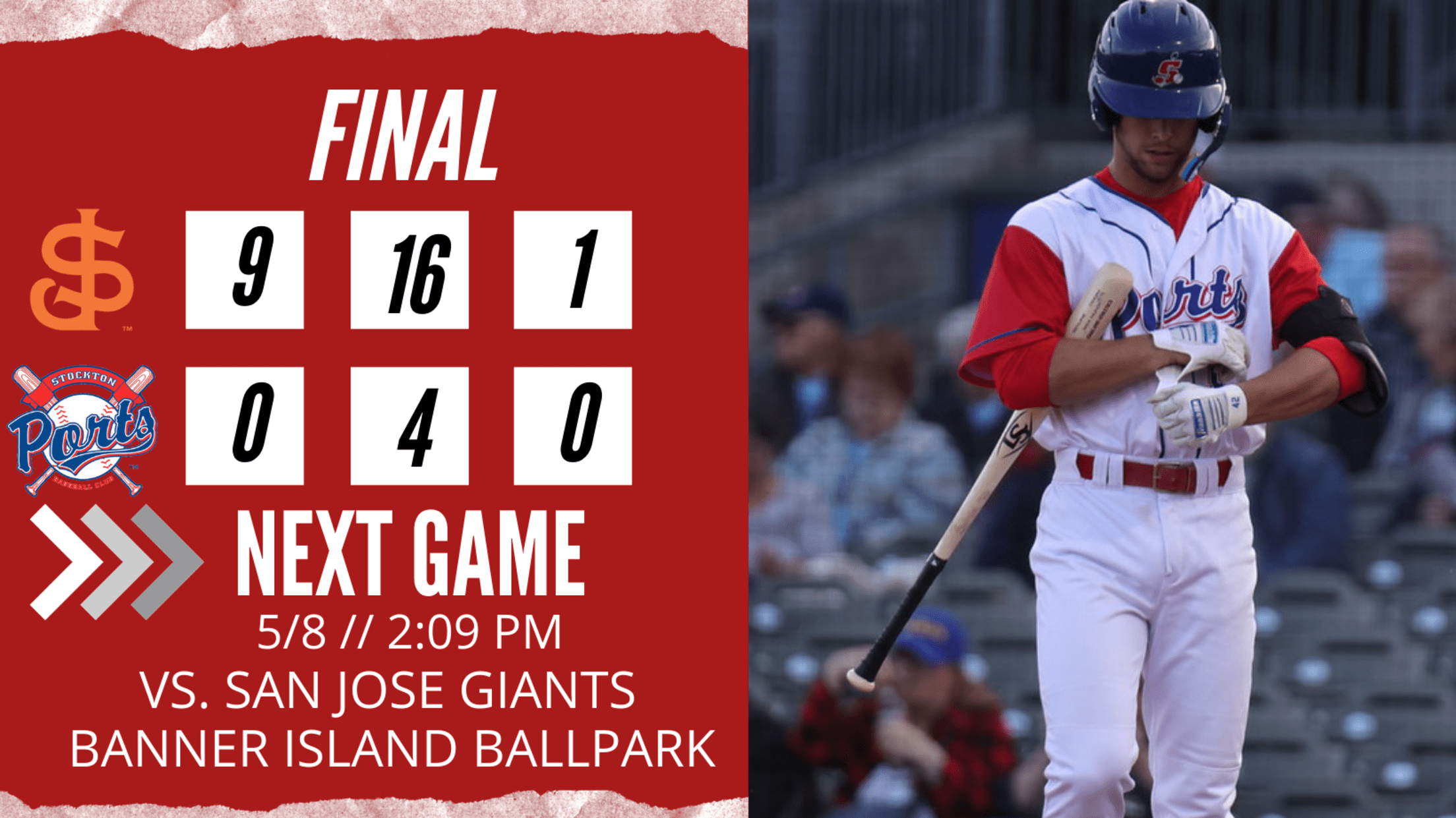 STOCKTON, Calif. — Saturday nights at Banner Island Ballpark are reserved for postgame firework shows. The San Jose Giants had other plans, bringing the fireworks inside with them as they used a 16-hit performance on offense to down the Stockton Ports by a final of 9-0 in front of 2,793 fans, the largest home crowd for the Ports this season.