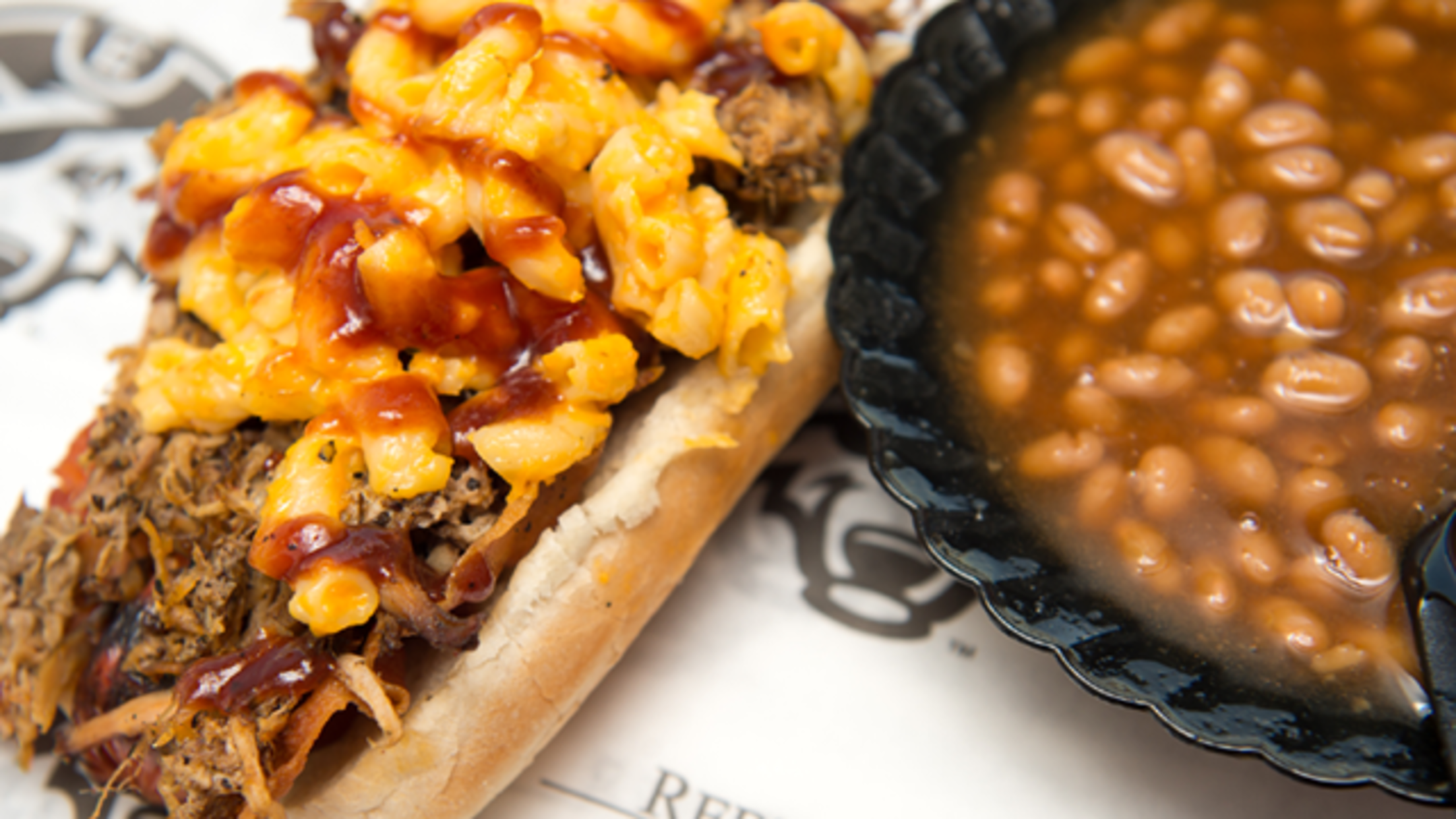 The Mojo & AC Rocket Dog, currently served at the Smith's Sausage Shack at UPMC Park, features a freshly grilled Jumbo Smith's Hot Dog, topped with in-house smoked pulled pork, homemade macaroni & cheese, grilled bacon and dressed with rocket fuel (BBQ sauce).
