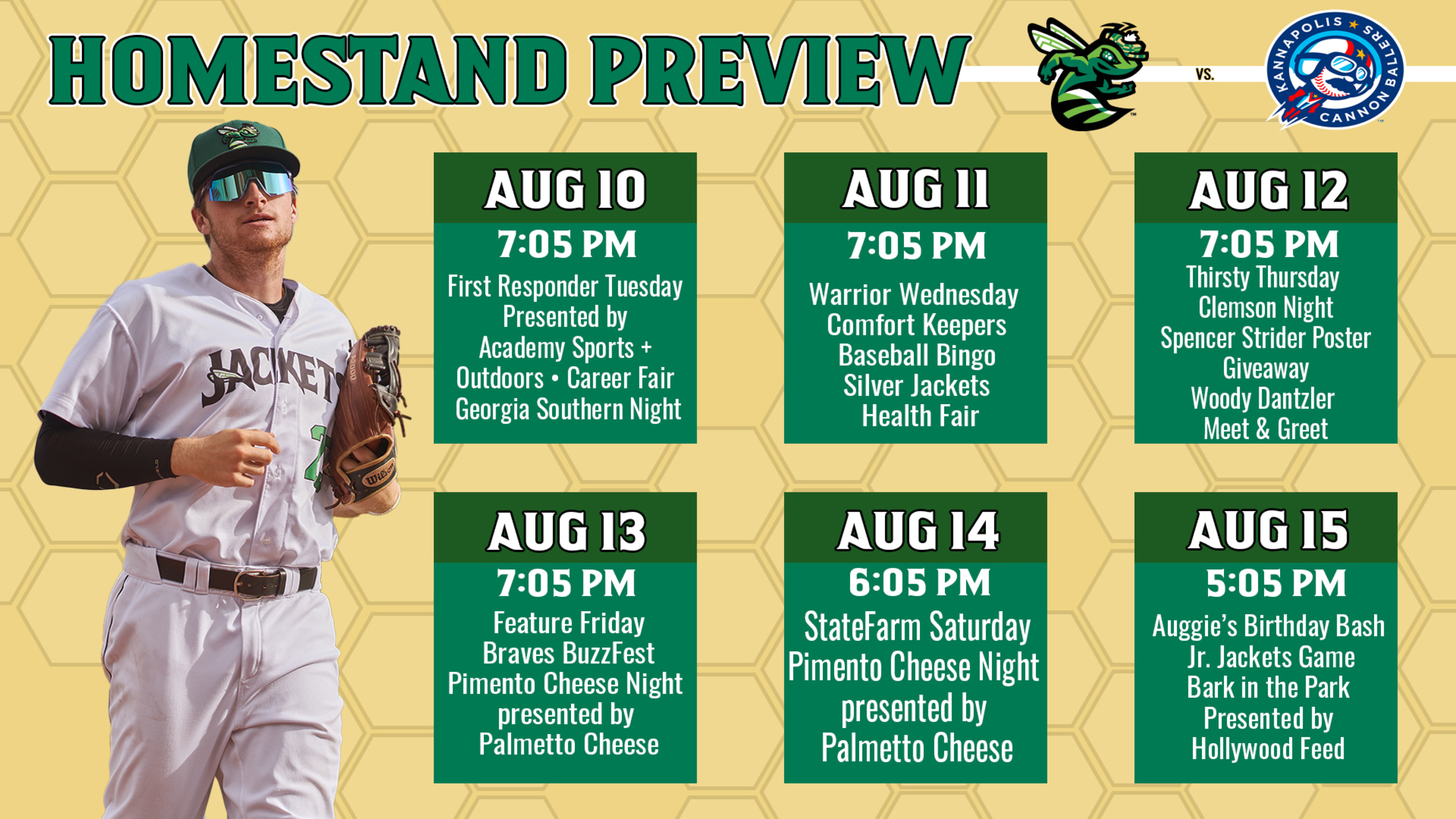 North Augusta, SC – The Augusta GreenJackets, Low-A East League affiliate of the Atlanta Braves, start a new homestand against the Kannapolis Cannon Ballers (Chicago White Sox) from August 10th-15th. Check out the complete lineup of promotions for the next 6 games below!