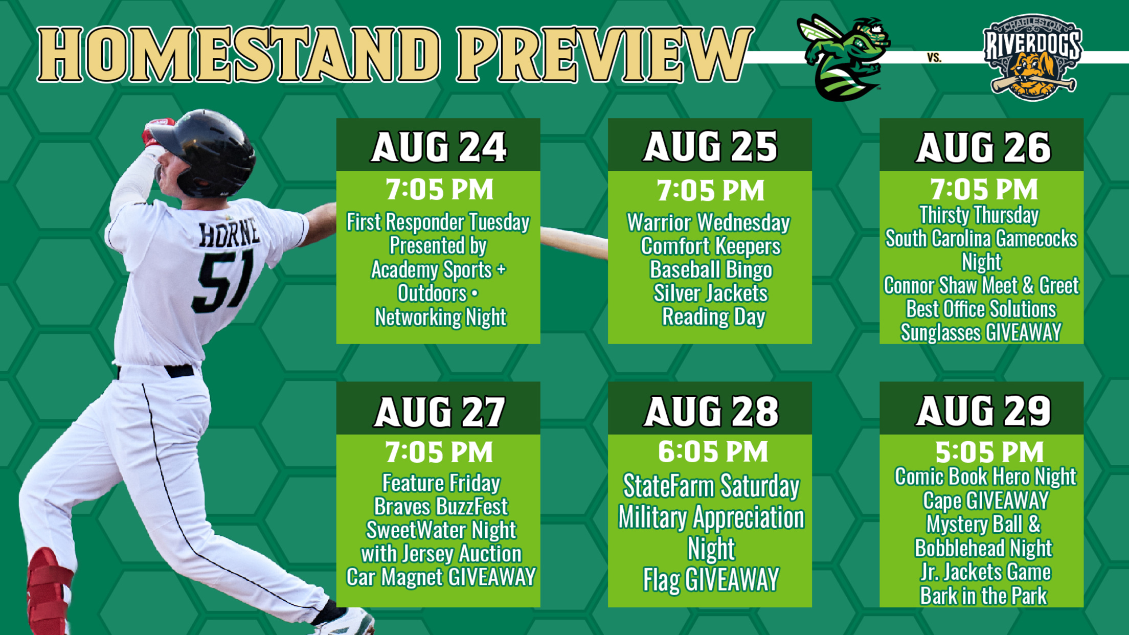 North Augusta, SC – The Augusta GreenJackets, Low-A East League affiliate of the Atlanta Braves welcome one of the most talented teams in Minor League Baseball to SRP Park. The Charleston RiverDogs (Tampa Bay Rays) will come to town for a six-game series beginning August 24th and concluding on August