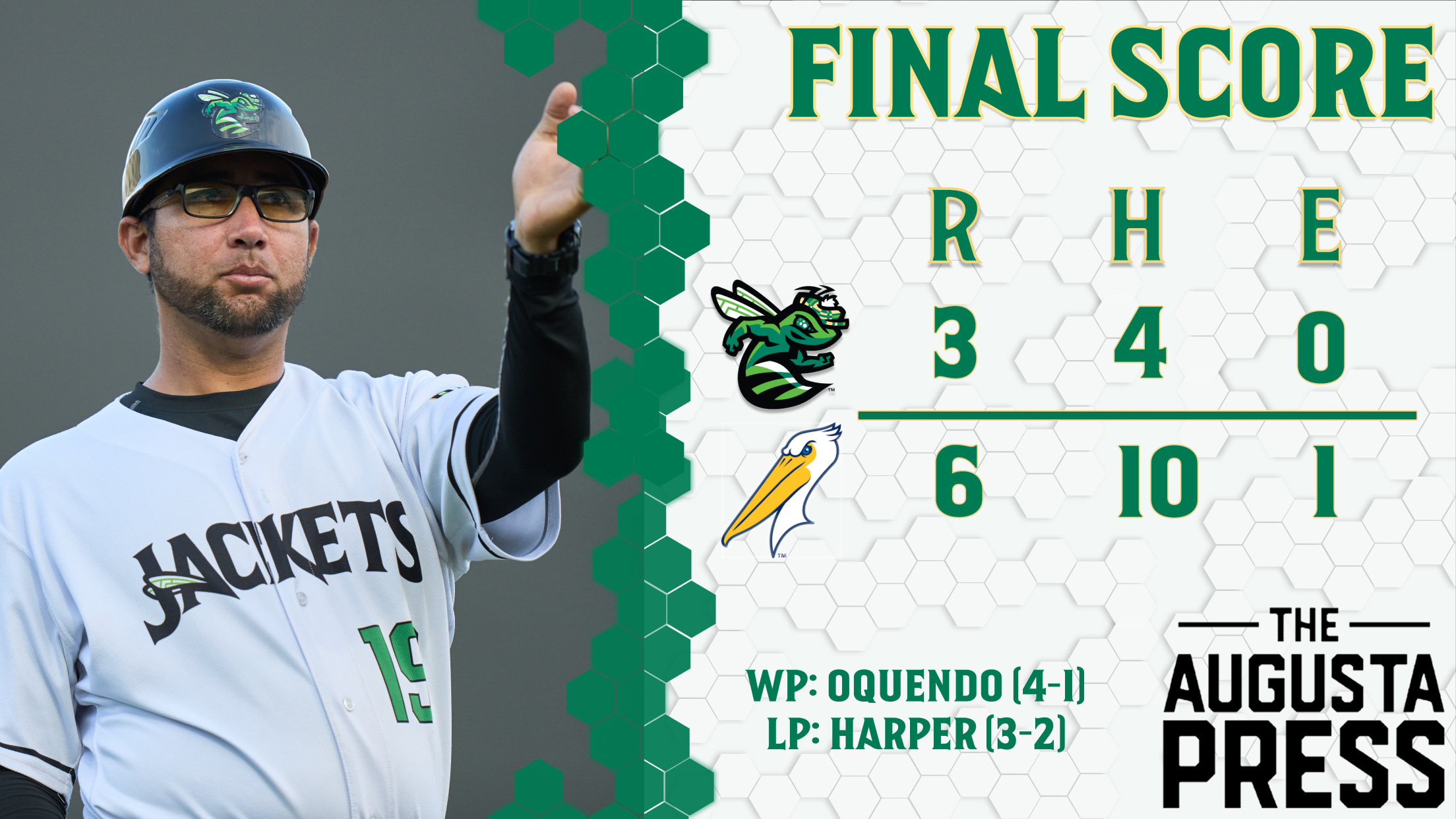 In the second game, the GreenJackets got on the board in the top of the first courtesy of a Bryson Worrell RBI single. However, the Pelicans tied it up in the bottom of the inning with a sacrifice fly off of Augusta starter Samuel Strickland. The GreenJackets retook the lead in the second inning on an Ethan Workinger fielder’s choice, but a two-run home run for the Pelicans off of Landon Harper (L, 3-2) in the bottom of the third gave the home side a 3-2 lead. Augusta tied it up in the sixth on an RBI hit-by-pitch for Jair Casanova, but four hits for the Pelicans in the bottom of the inning would drive home three runs to make it 6-3.