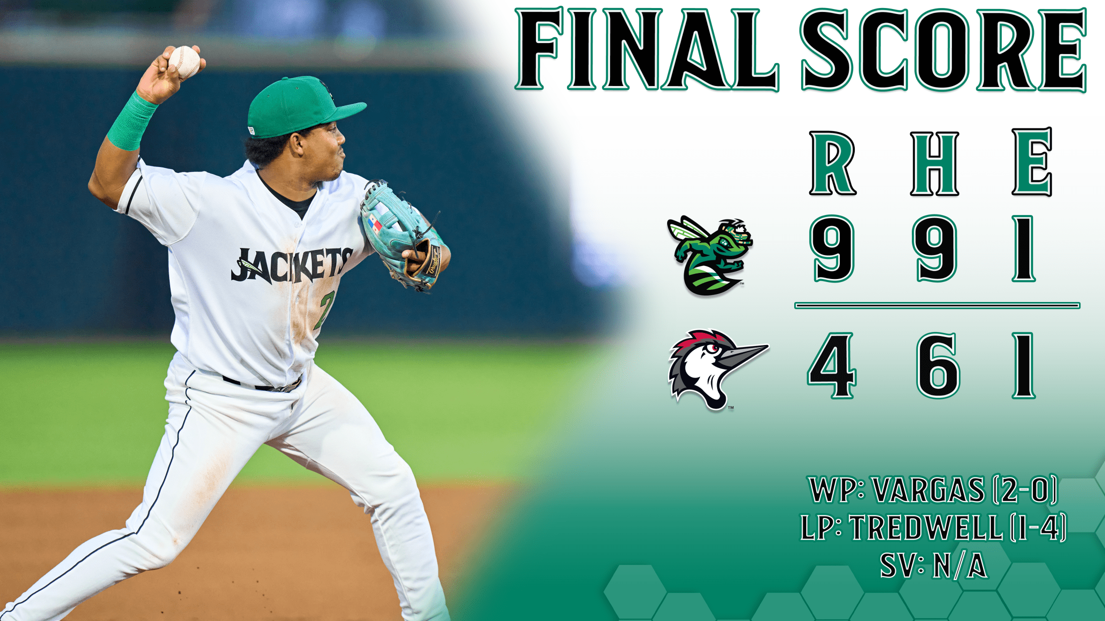FAYETTEVILLE, NC: The GreenJacket bats broke out in a big way at Segra Stadium Wednesday night, scoring early and often to provide more than the necessary cushion for starter Luis Vargas in a 9-4 victory.