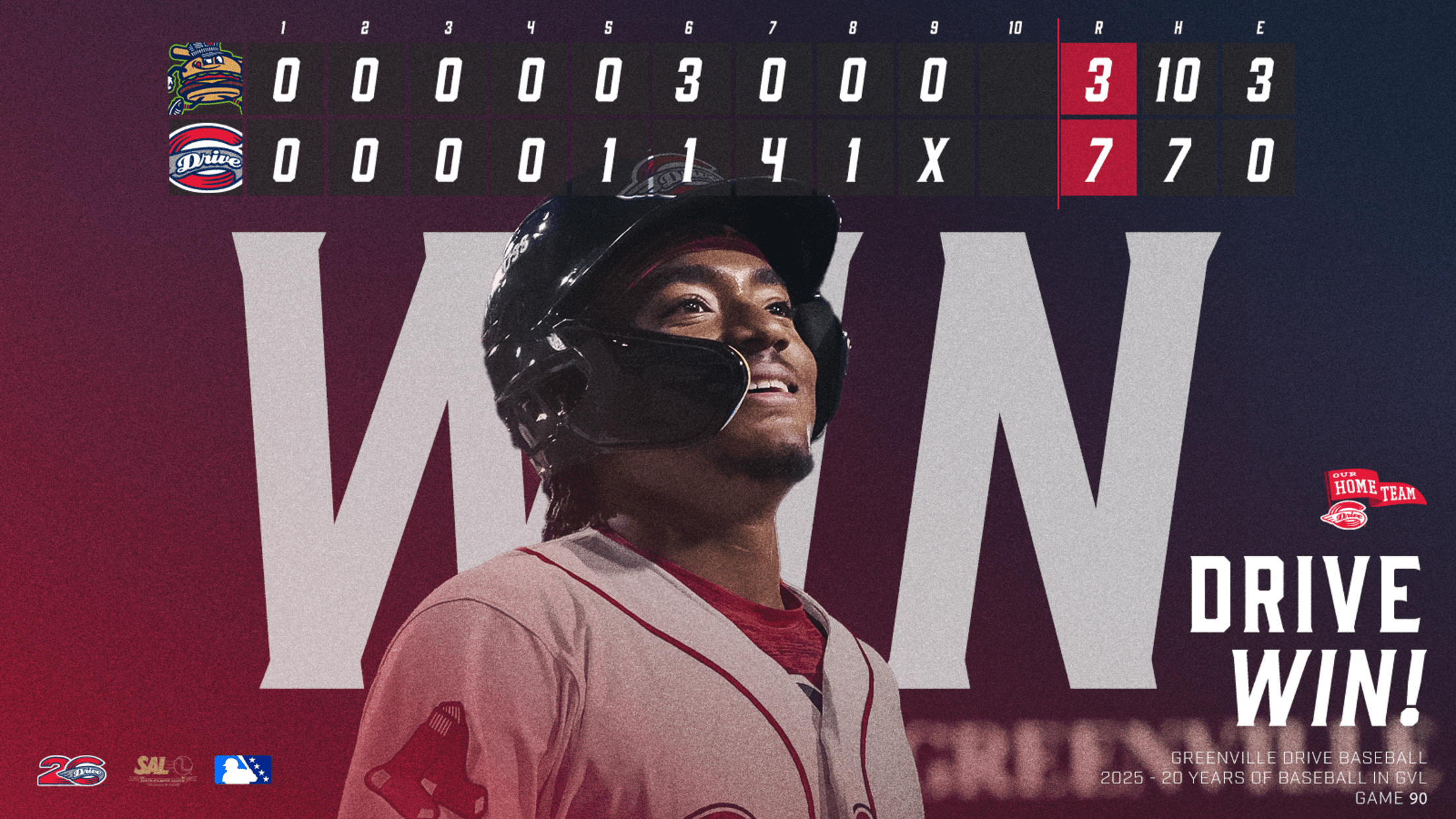 Greenville Drive Surge Past Spartanburgers with Late Rally, Win 7-3 in Game Two Greenville, S.C. — For five innings, the Greenville Drive were nearly invisible at the plate. Then, in a flurry of base hits, wild pitches, and defensive lapses, they roared to life; erasing a 3-1 deficit and storming