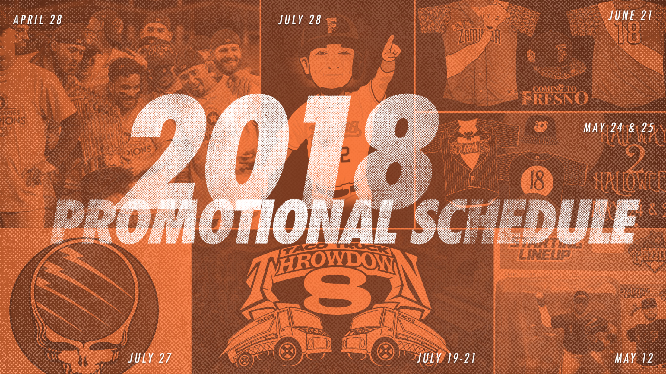FRESNO, Calif. - The Fresno Grizzlies have announced their 2018 promotional lineup, complete with more original big-ticket giveaways, ground-breaking specialty jerseys/theme nights and expanded plans for Taco Truck Throwdown 8. Dependable favorites such as "Halfway to Halloween" and Friday Night Fireworks are also back for the Grizzlies' 21stseason of Triple-A