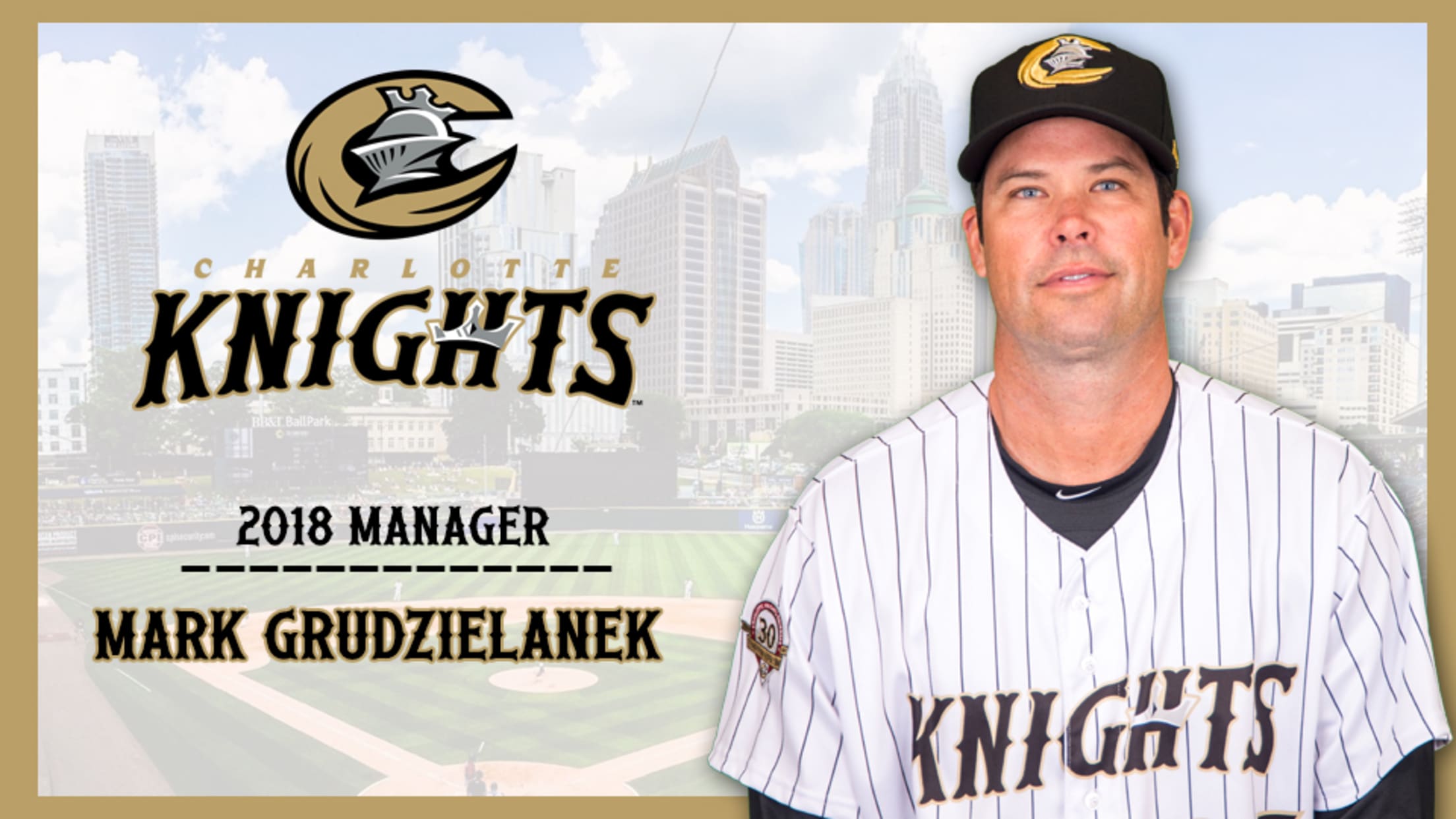 (UPTOWN CHARLOTTE, NC) - Mark Grudzielanek, who made his Triple-A managerial debut last season with the Charlotte Knights, will return to Uptown Charlotte to manage the club for a second consecutive season in 2018. Grudzielanek, a 15-year major league veteran, will be joined by returnees Steve McCatty (pitching coach), Andy