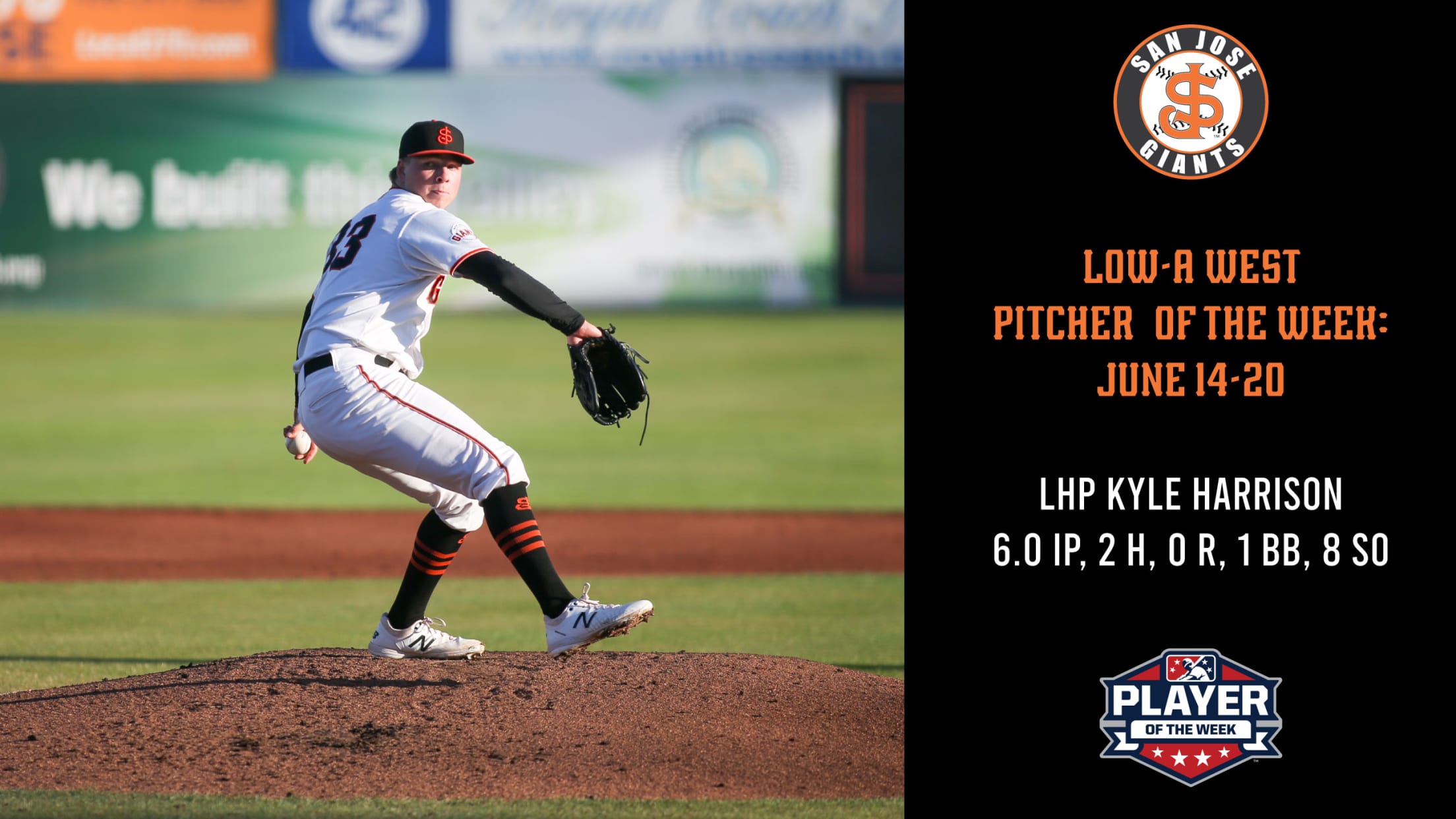 San Jose, CA - San Jose Giants starting pitcher Kyle Harrison was acknowledged by Minor League Baseball as the Low-A West Pitcher of the Week after his dominant performance in Modesto on June 18. Harrison becomes the third San Jose Giant to earn Low-A West honors, joining fellow starting pitcher