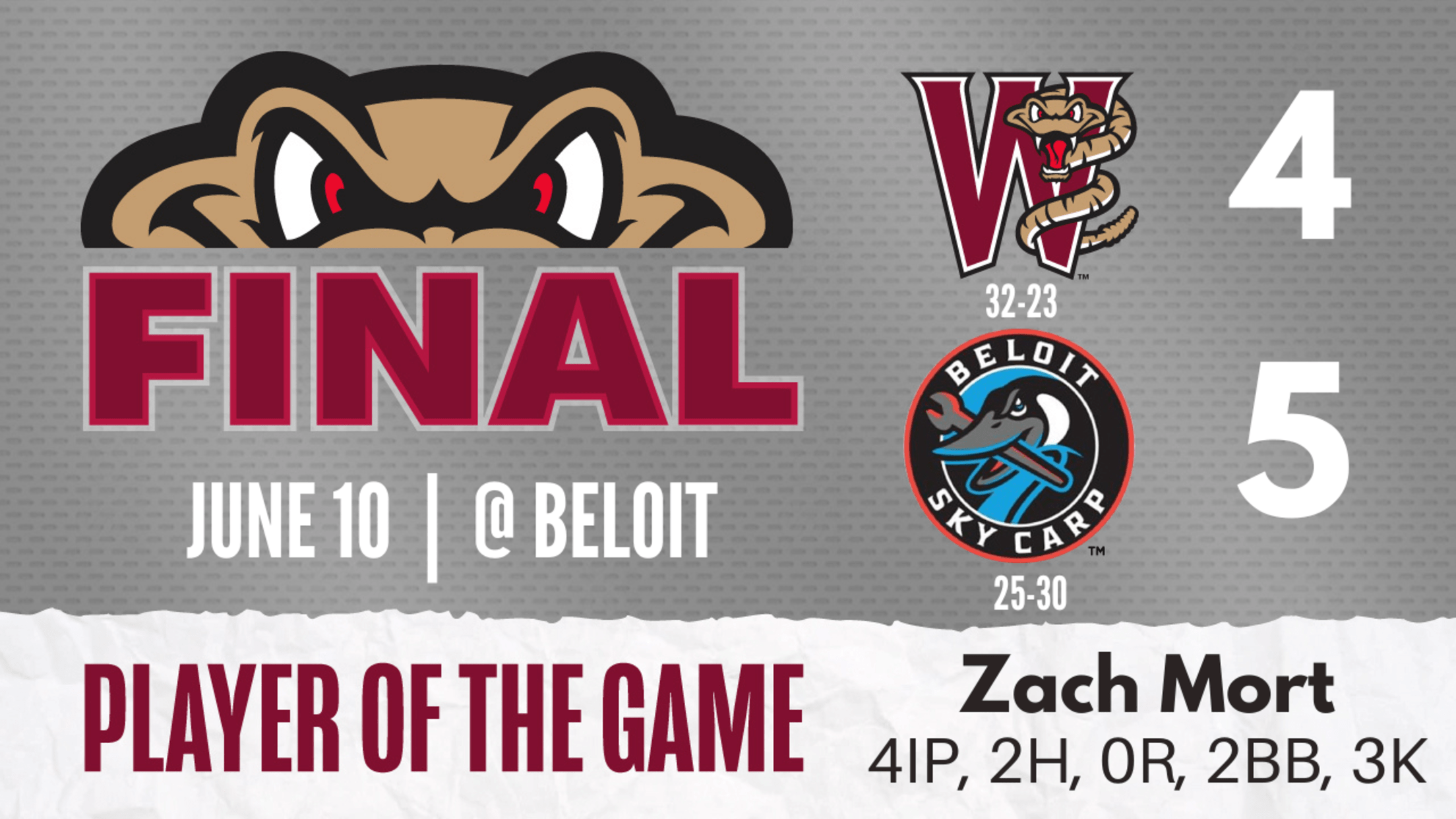 The game was a pitchers’ duel early. Wisconsin starter Max Lazar worked two perfect innings and reliever Zach Mort worked four scoreless frames out of the bullpen. Beloit starter Evan Fitterer kept the Rattlers off the board through five innings and retired the first two batters of the sixth before he cracked.
