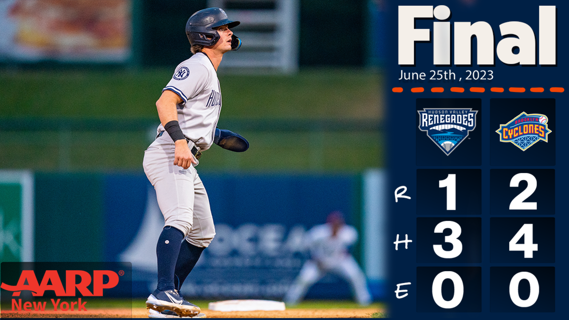 BROOKLYN, N.Y. (June 25, 2023) — The Brooklyn Cyclones defeated the Hudson Valley Renegades 2-1 on Sunday afternoon at Maimonides Park in walk off fashion on a wild pitch in the bottom of the ninth.