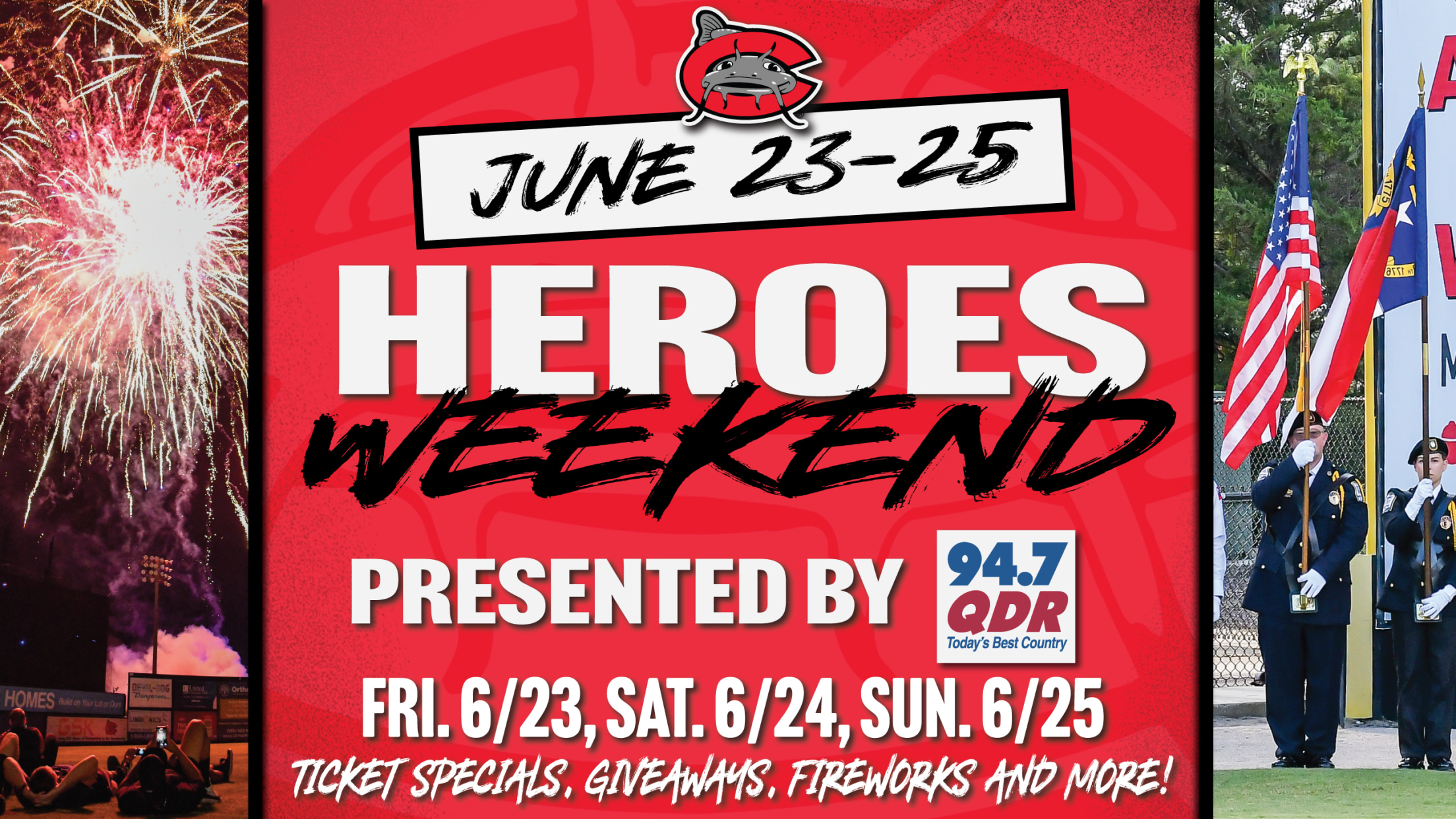 ZEBULON, N.C. – The Carolina Mudcats are honored to host “Mudcats Heroes Weekend,” presented by 94.7 QDR, coming to Five County Stadium with First Responders Night and a souvenir t-shirt giveaway on Friday, June 23, Military Appreciation Night with a souvenir jersey giveaway on Saturday, June 24, and Teacher Appreciation