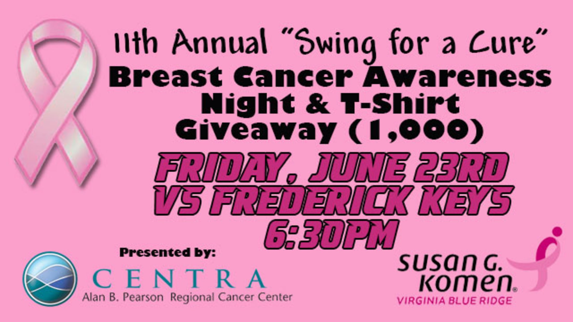 The Hillcats will have everyone wearing pink on Friday, June 23rd at 6:30 p.m. with their 11th Annual "Swing For A Cure" Breast Cancer Awareness Night presented by Centra's Alan B. Pearson Regional Cancer Center! Proceeds from this event will benefit the Susan G. Komen For the Cure Foundation.