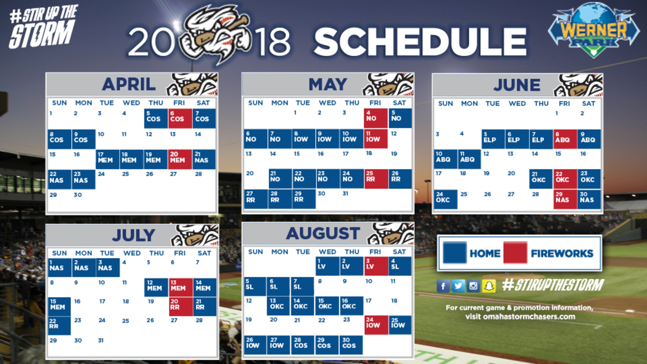 The Omaha Storm Chasers in conjunction with the Pacific Coast League have announced their home dates for the 2018 season, which will be the Omaha franchise's 50th year. The Storm Chasers are slated to begin the monumental campaign at Werner Park on Thursday, April 5, 2018 against the Colorado Springs