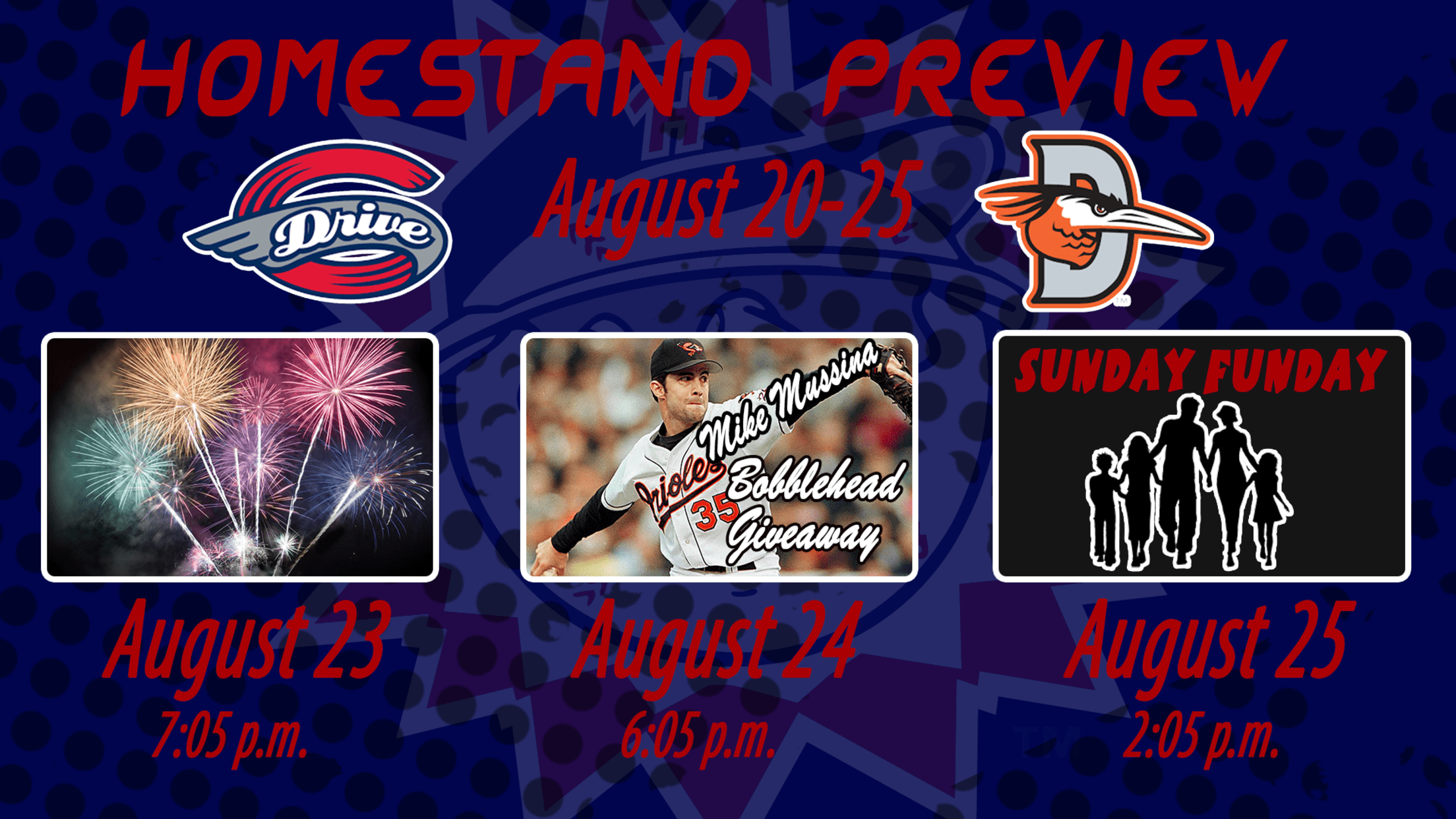 The Hagerstown Suns welcome the Greenville Drive and the Delmarva Shorebirds to Municipal Stadium for a six-game homestand August 20-25. Each team will be in Hagerstown for a three-game series.The Suns are 1-2 against the Drive this season after dropping a series in Greenville April 22-24. Hagerstown is 6-13 against